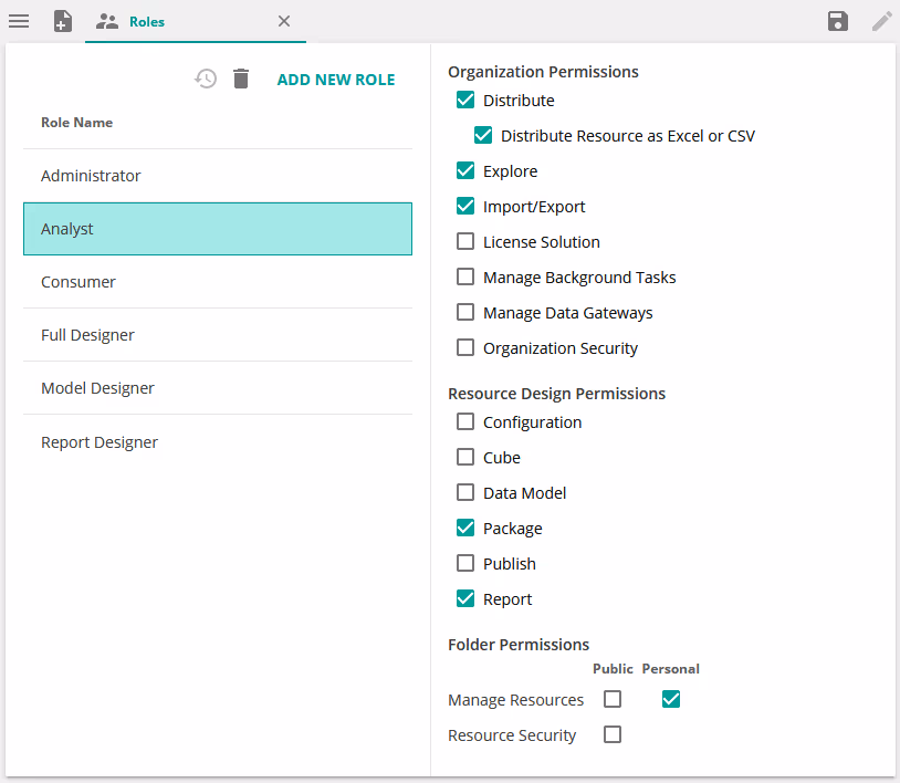An Analyst performs all tasks that a Consumer can do, but can also create resources in the package category (dashboard, report pack, webpage, image, and rich text resources), the report category (analysis report, chart and, drill-through), and the elements category (calculated member, function, named set and, shape). The resources must be saved in the user's personal folder. Analysts can also export and import resources.