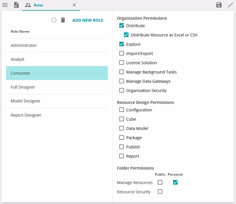 The consumer role is able to view existing resources (read-only access) and perform resource management tasks (copy, paste, rename, save as and delete) in their personal folder only, but is not able to create or distribute resources.