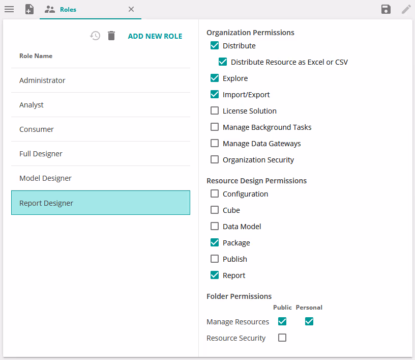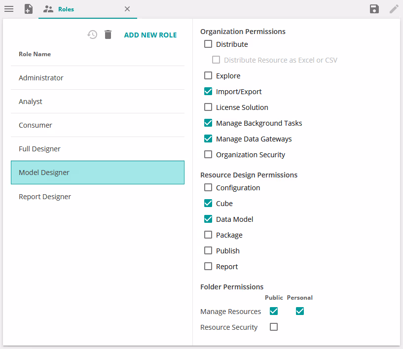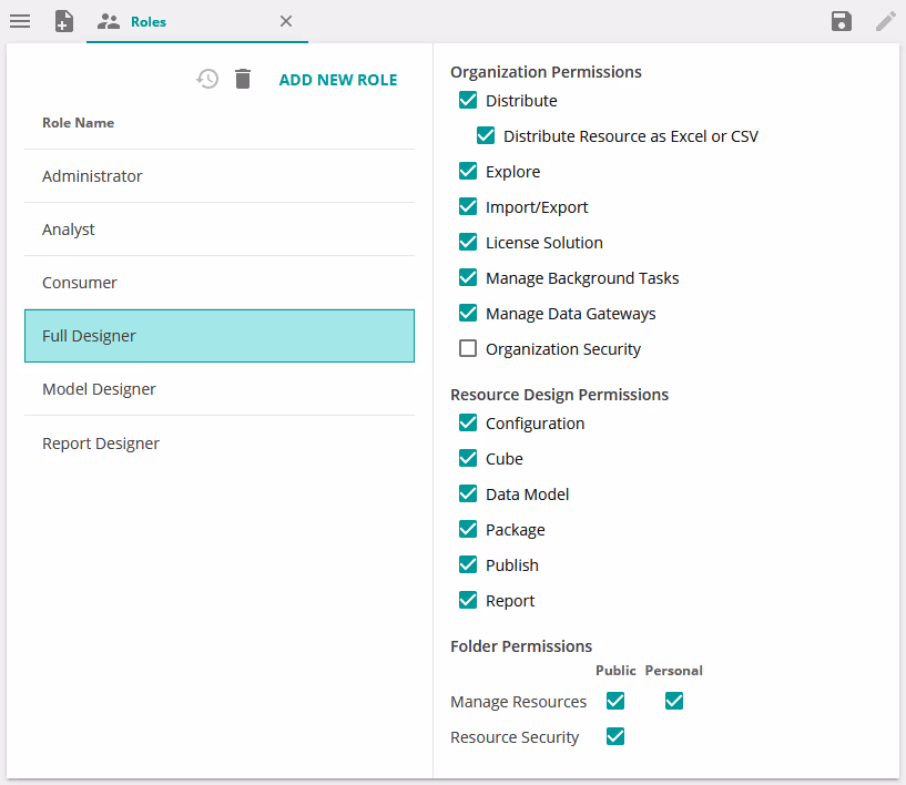 A Full designer Creates and designs resources in every category, including background tasks, data models, events, publication rules, data sources, models, and cube servers. This role is able to license solutions and manage resource security. The only restriction is on managing organization security (granted with the Administrator role).