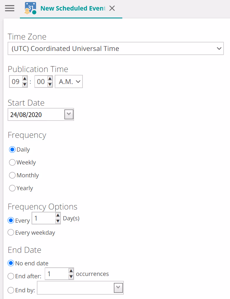 noteIf the Events area is left blank, the email will be sent when you click Publish.