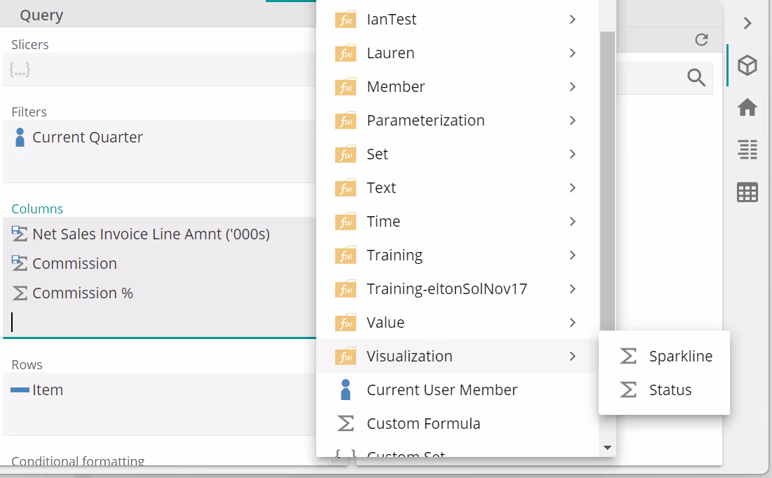 Filter the data set using the Filters placeholder. Hover to create a custom formula, named set, or function, drag a hierarchy or level into the section.