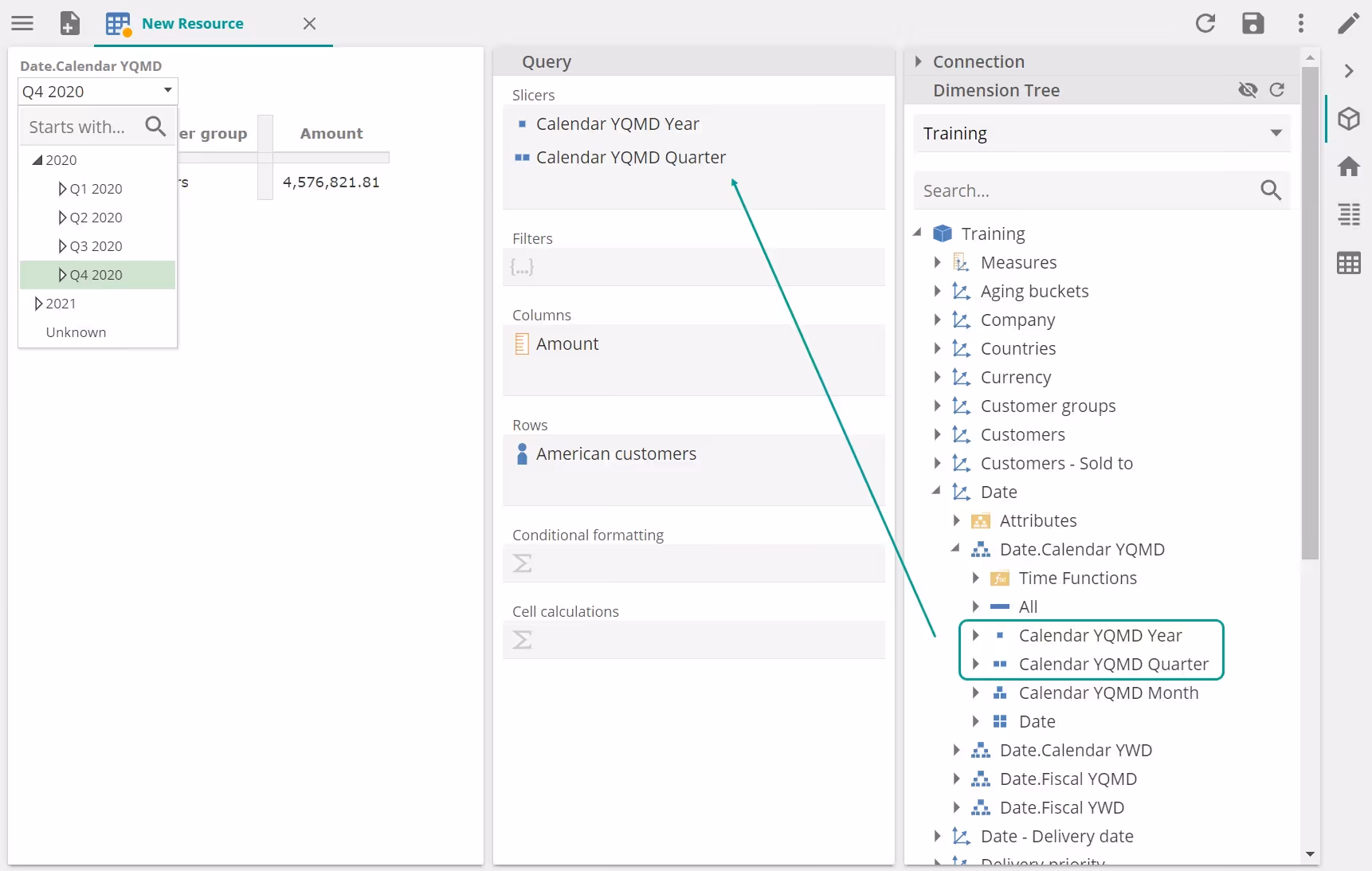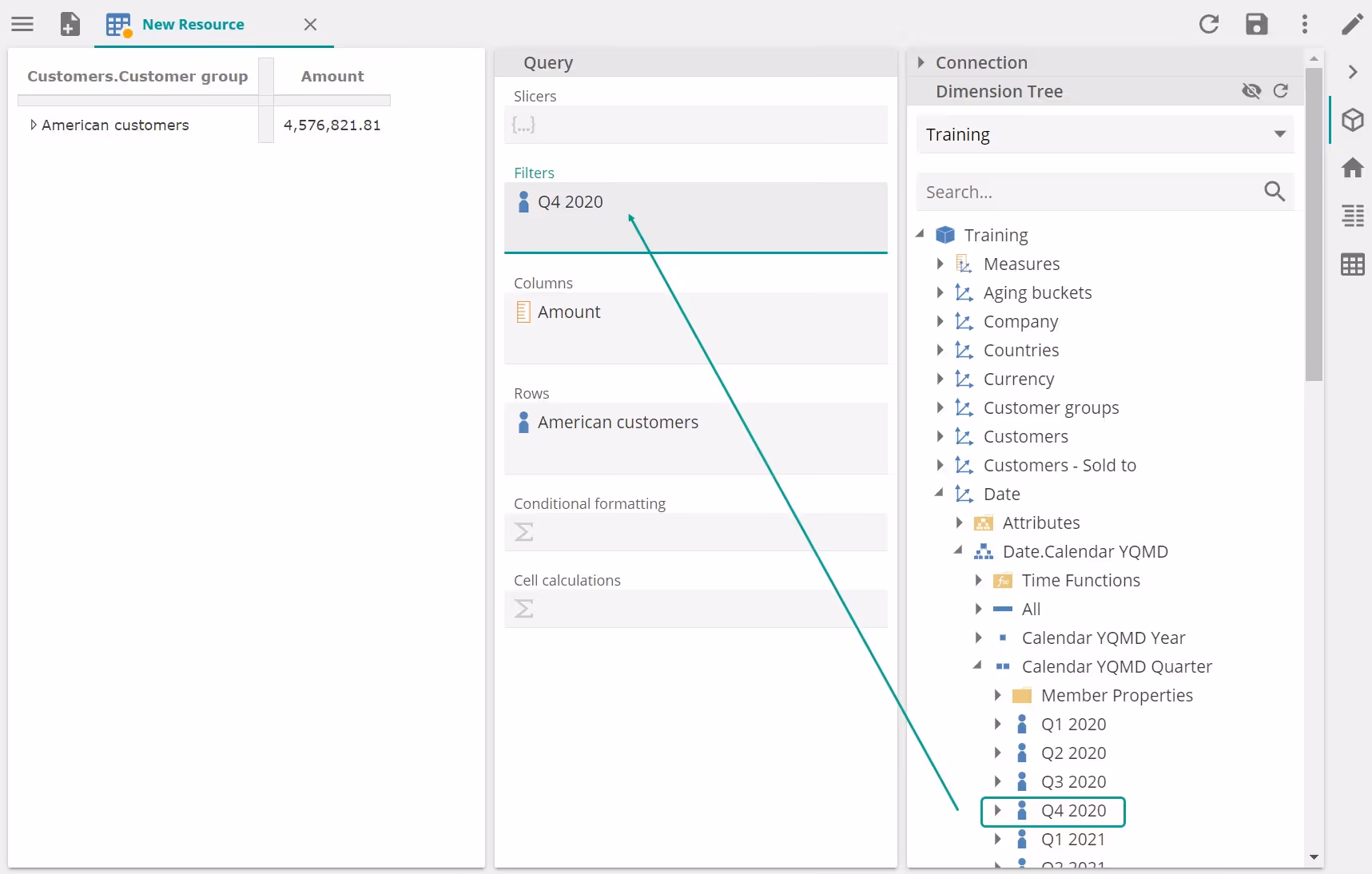 Drag elements from the Dimension Tree or existing resources such as charts, functions, or named sets from the Resource Explorer to the Rows or Columns placeholders in the Query window