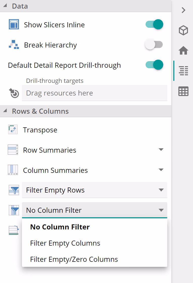 - Click the Filter Column or Filter Row drop-down to filter empty or zero rows or columns.