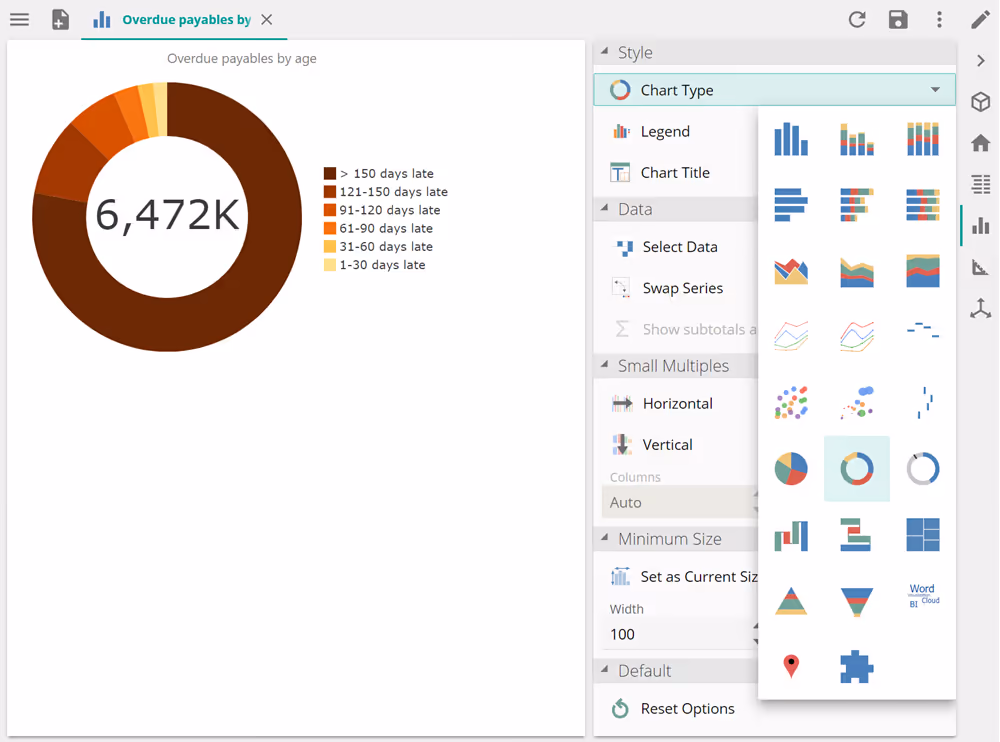 In the examples in the following topics, only pie charts are mentioned specifically. However, the behavior applies to all chart types mentioned above: pie charts, pyramid charts, funnel charts, treemaps, and word clouds. For more information on which chart types behave similarly when using small multiples, see About General Small Multiple Behavior.