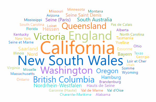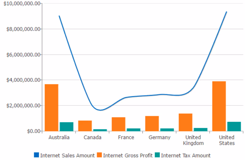In the following example chart, the Internet Sales Amount (per product) is shown for two countries: Australia and the United States. Values for Australia are on the horizontal axis, while values for the United States are on the vertical axis (determined by the order of the countries on the Columns placeholder).