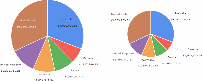 A pie chart represents a single data series as portions (sectors) of a circle. If multiple series are present, only the first series is used to construct the pie chart; the other series are shown in tool tips that appear when hovering on a segment. Multiple pie charts, one for each series, may be displayed using the Small multiples feature.