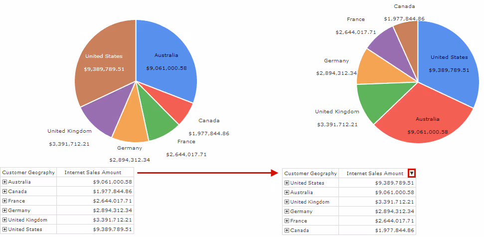 In the following example, the Internet Sales Amount column has been sorted in descending order. Pie chart sectors are always presented clockwise from the "12 o'clock" position.