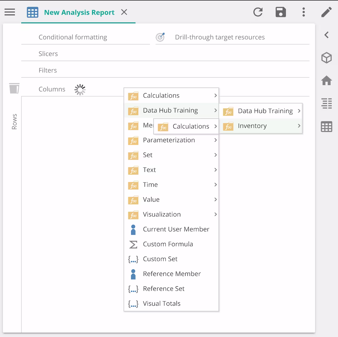 A reduced functions list is shown when right clicking on a member placeholder in a report axis first, and then using the right click context menu. This filters the list to show functions only relevant to the selected member.