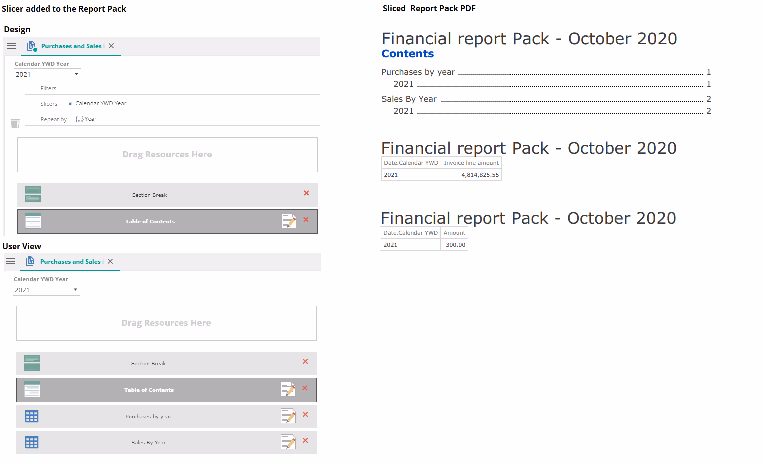 Repeat by Placeholder ONLY | The report pack arranges the data on 6 separate pages of the printed PDF. Each page shows an individual year's information, with purchase information being shown first, followed immediately by the same year's sales data. In other words, the pages are grouped by Year (specified repeat by member) and then by analysis. |
