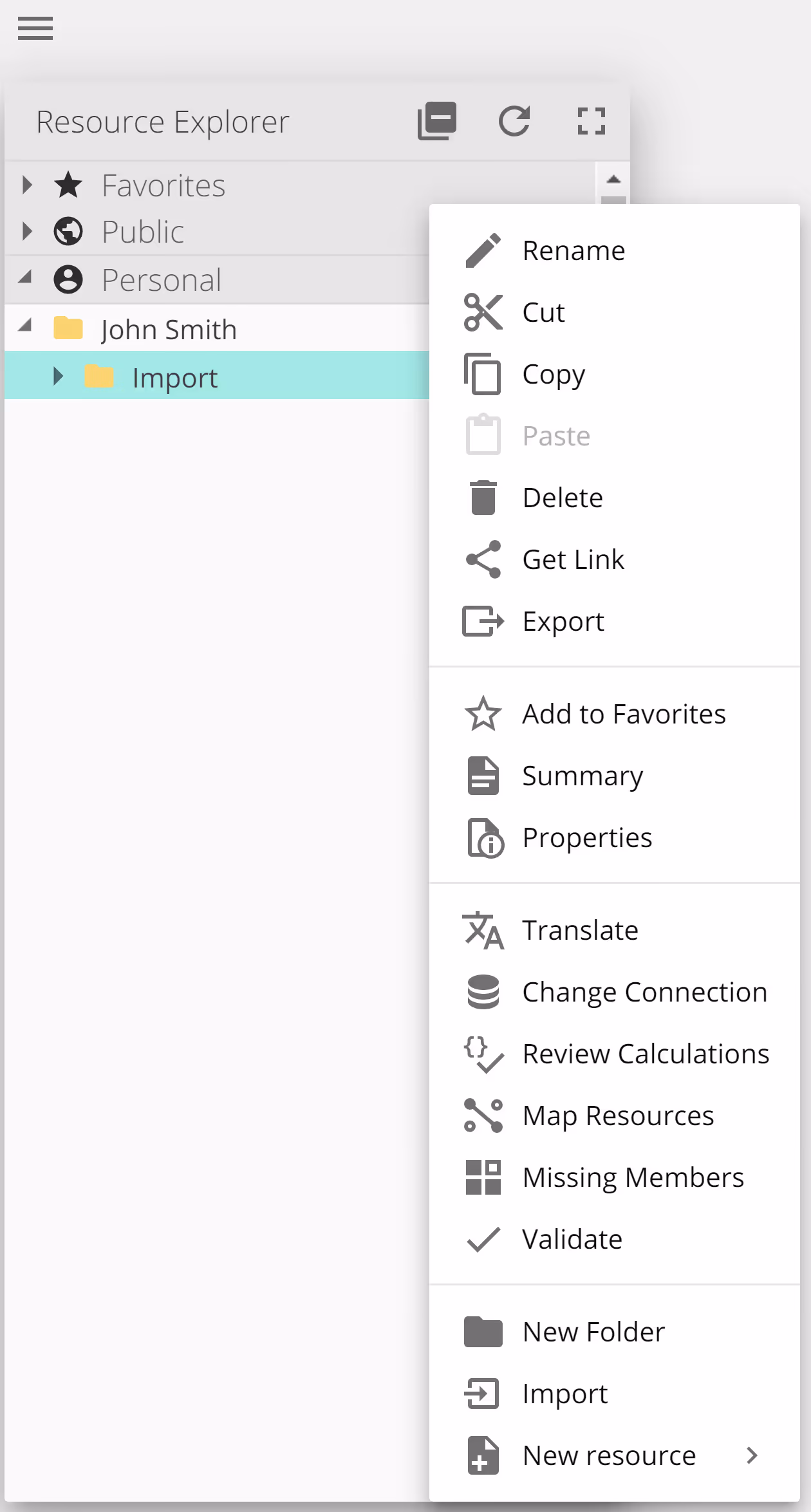 When working with analytical reports and resources, the need may arise to duplicate or re-use resources. Data Hub provides the ability to copy, export and import any existing resources for re-use in different environments. When resources are copied or imported from an external environment, they will have mappings and dependencies on data members and supporting resources that will need to be re-mapped when used in a new environment.