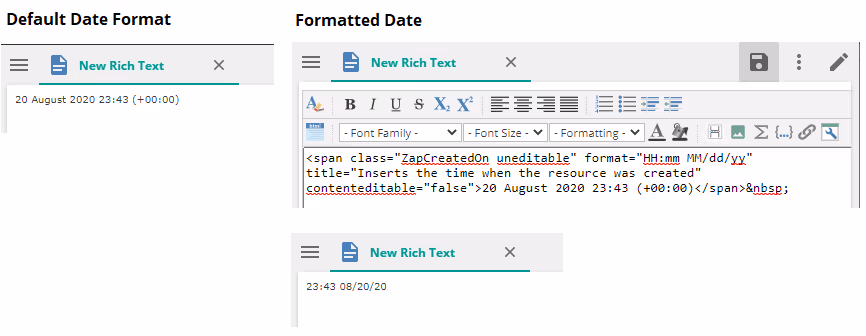 Modified On | The date, time, and timezone when the rich text resource was last modified (edited). The date format may be controlled as detailed in Formatting Dynamic Date Fields, below |