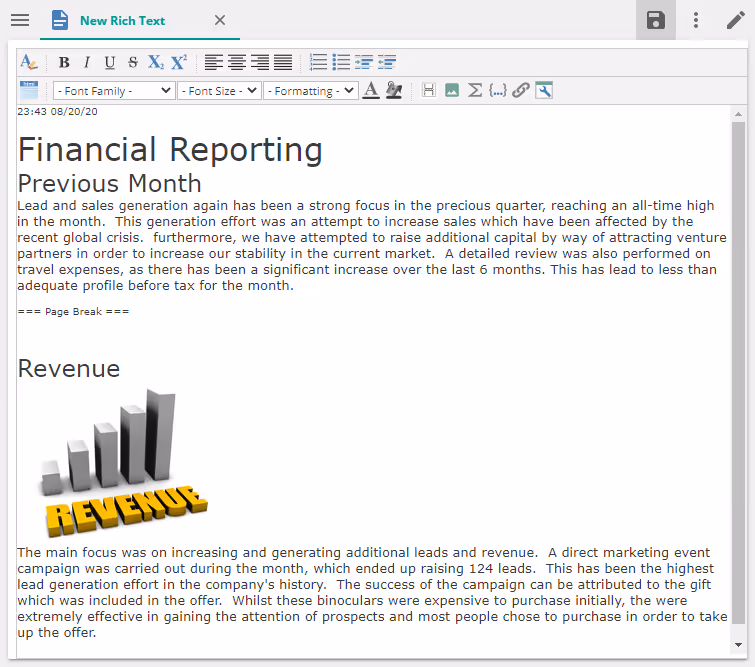 For example, a rich text resource could include an executive summary for a quarterly report, analytical or conclusive commentaries on provided analysis reports, or even a high-resolution company logo for use as a title page.