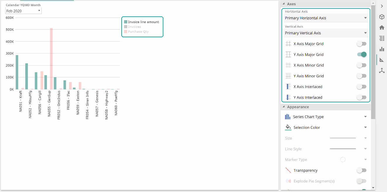We turn to the Design design panel. At the top is the Axis section. To use any of the options in this section, you first need to select a chart series. Recall a series is a series of values, not a single value; therefore, selecting a single value (bar/column/slice) won't suffice. You select a series from the legend, or if you are showing both the chart and the pivot, you may select the series by selecting its associated row or column on the table. The following image shows the Invoice line amount series is selected (the non-selected series are washed-out), and the Axes section options are now available.