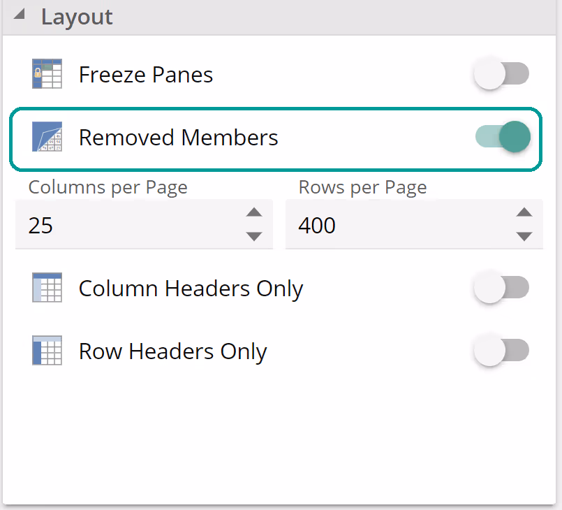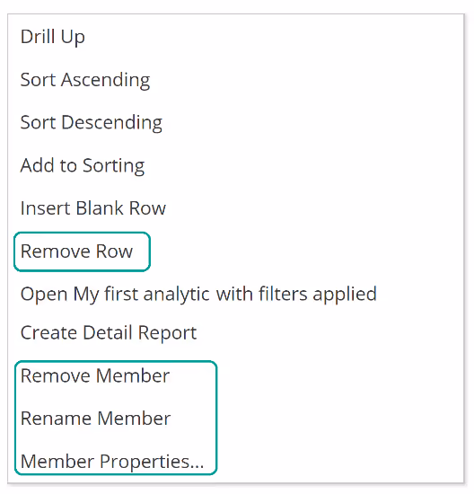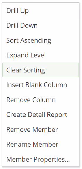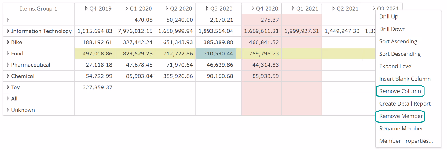 If you choose to resize a non-blank column, the fixed-width may cause issues for new data values over time. You can restore a column to a dynamic (fit-to-contents) width by double-clicking the same border that you used to resize. Having inserted a blank column, you can also remove it from its header menu using the Remove Blank Column option. This brings us to removing columns and members. Both options are available from the header menu.
