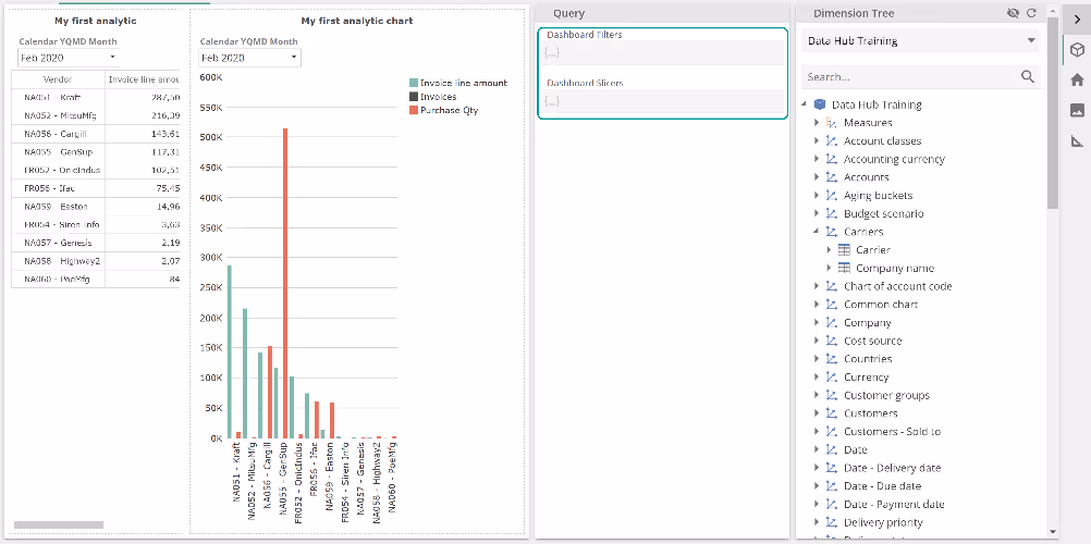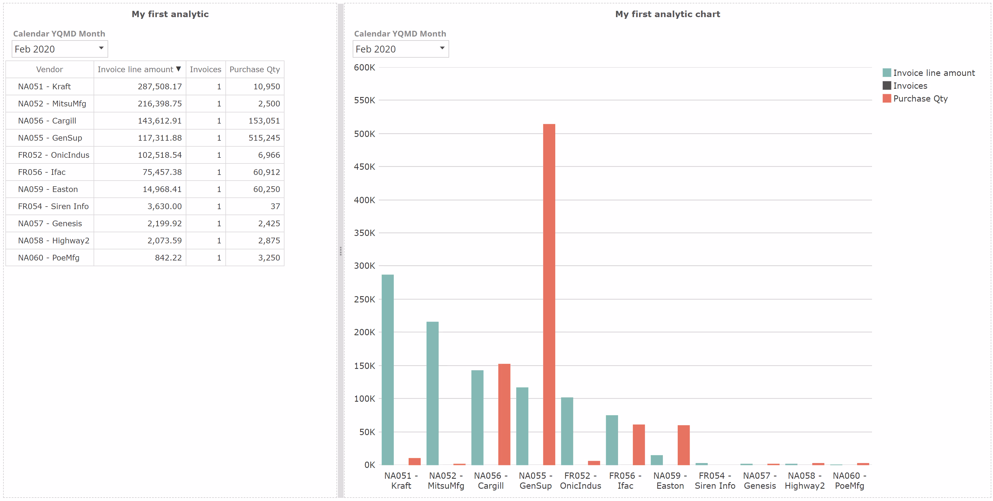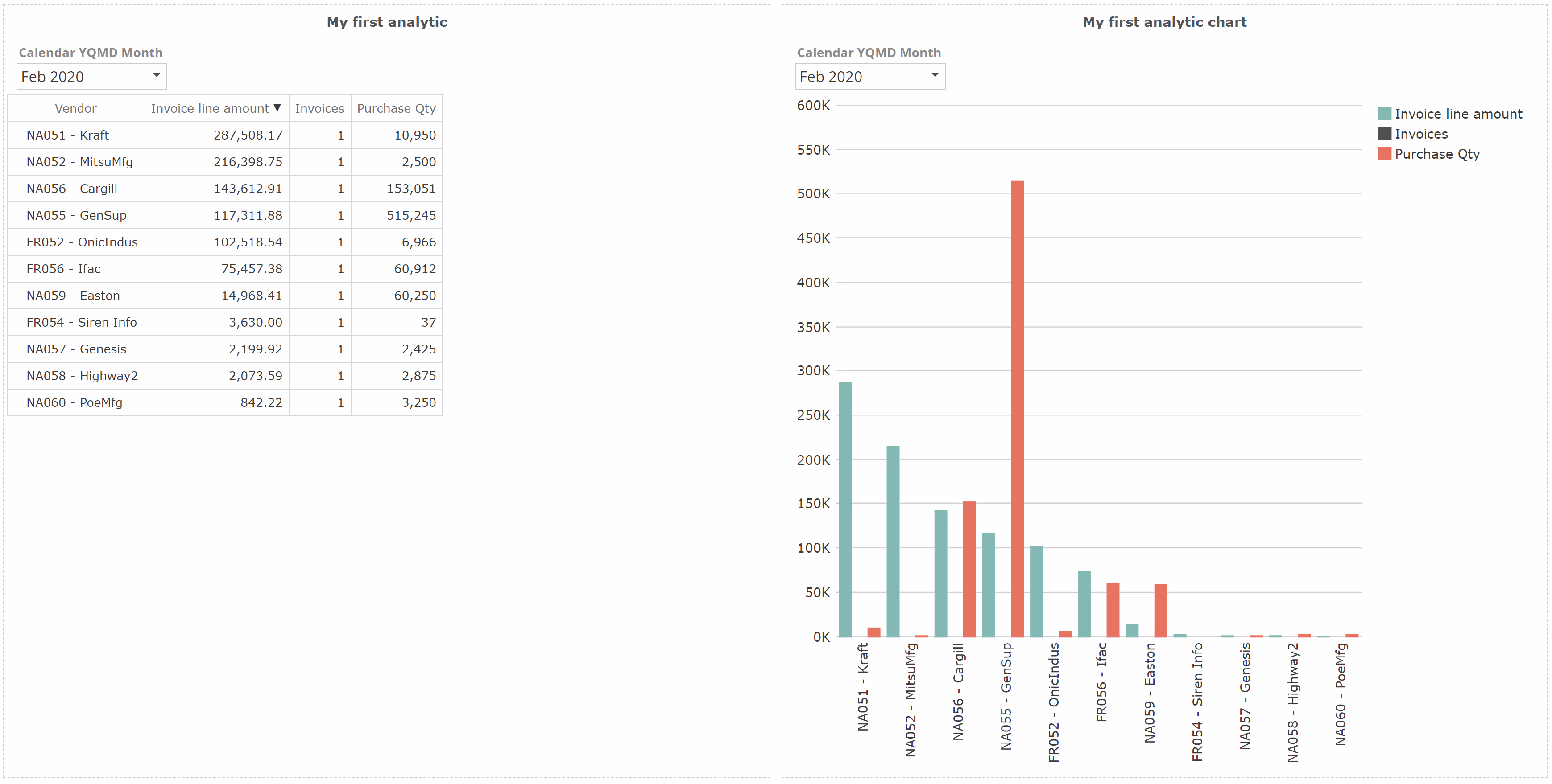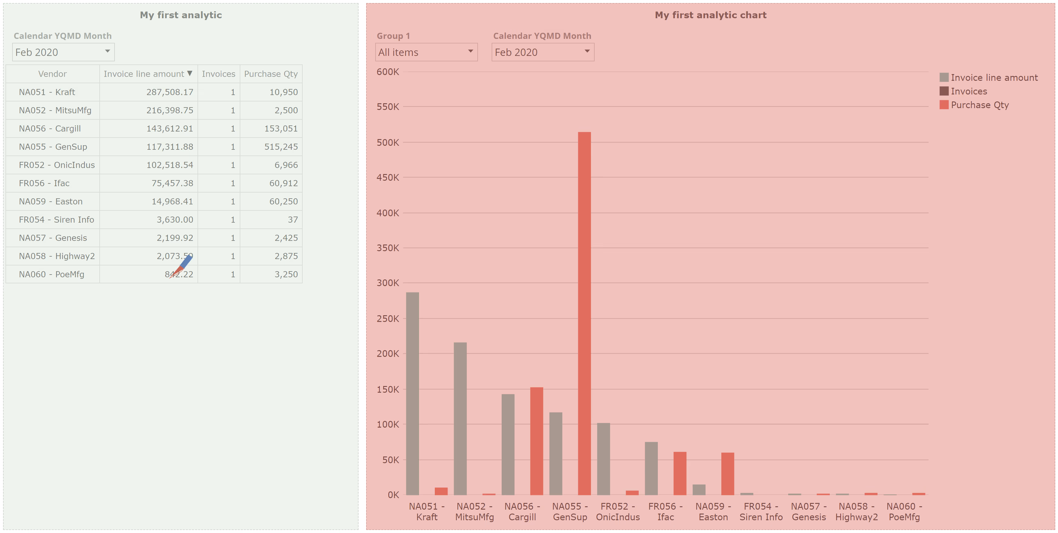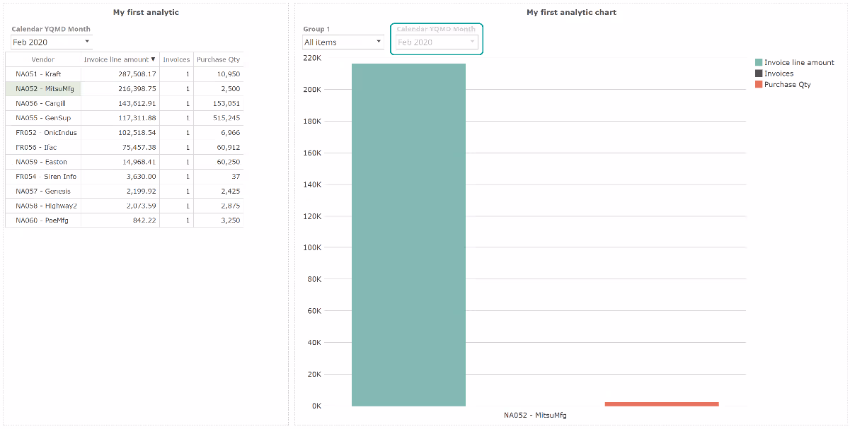 You will also see that we've highlighted the disabled Slicer in the My first analytic chart. Because the left cell (with its own Calendar YQMD Month) Slicer is now inter-cell slicing the right cell, we have a conflict. Importantly this only happens where Slicers use the same hierarchy (Calendar YQMD Month in this case). Where you encounter this, the outer Slicer will apply, and the inner Slicer will be disabled. The outer Slicer is that defined in the containing resource. There may be multiple layers of slicing between the dashboard and contained Analysis Reports for extremely intricate analytics. In such a case, you may find that the simple outer-Slicer-applies rule does not fully describe the behavior you see, and you should refer to this article for further detail on the interplay between different levels of Slicers and filters.
