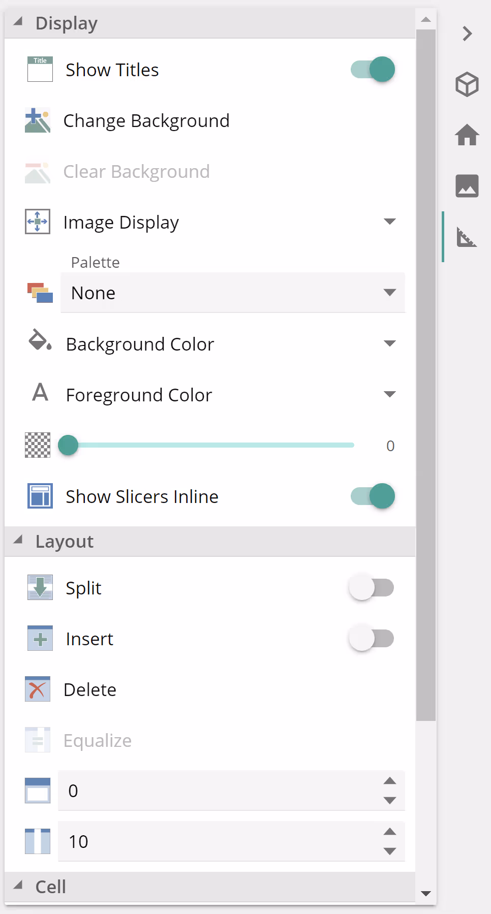 Cell slicing and filtering – by selecting a cell using the cell's top-right checkbox, it is possible to apply slicing and filtering to only that cell.