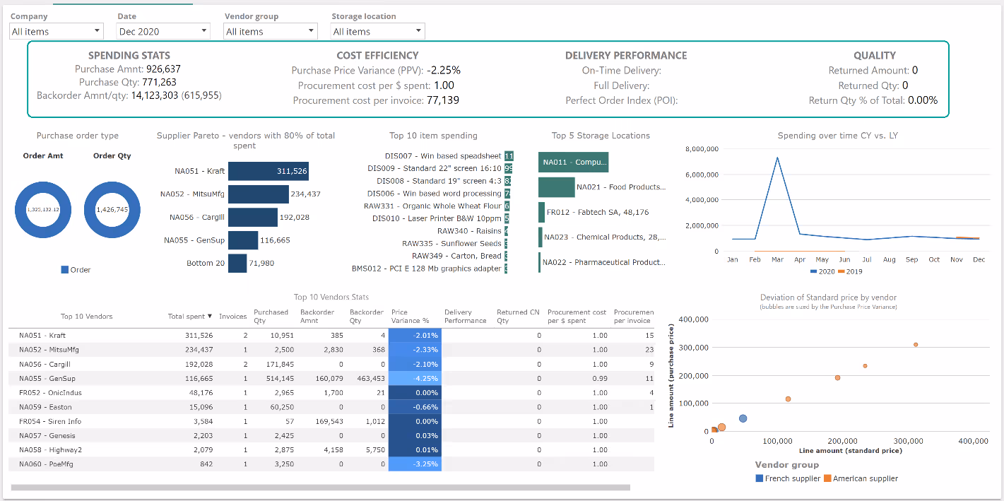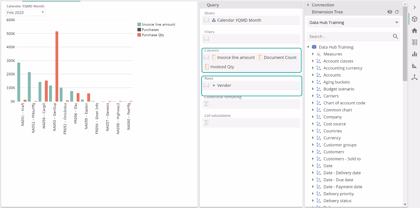 Our example shows three series: a series of Invoice line amount values (green), a series of Purchase values (black), and a series of Purchase Qty values (red). And each series of values is categorized by the Vendor attribute members.