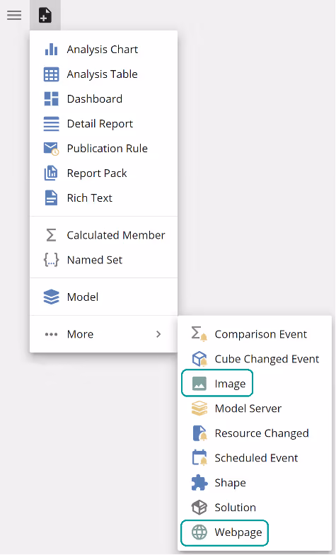 Similar to Rich Text resources, the Image and Webpage resources are intended for use in dashboard cells. As with all resources, resources are created from the New resource button.