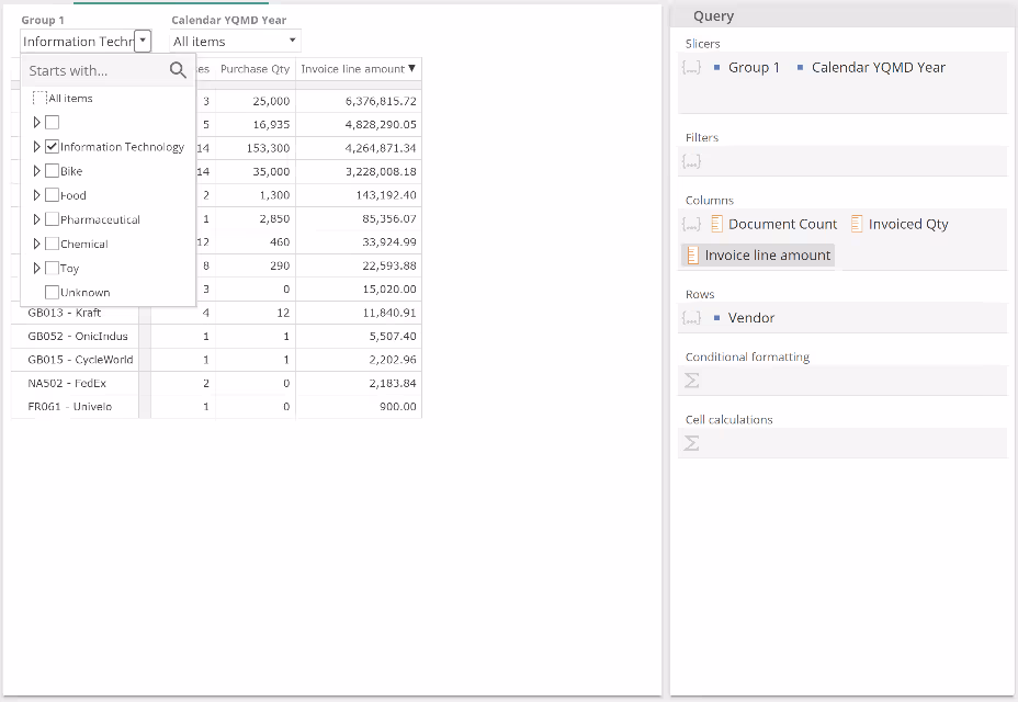 Returning quickly to sorting, recall in a previous example we combined two different hierarchies on the Rows placeholder to demonstrate how different hierarchies are combined on the table. Recall each Item.Group 1 member is combined with each Vendor member, so we now have vendor purchases for each item group. Previously we removed sorting to simplify the example, but let's now look at the result when we reinstate sorting.