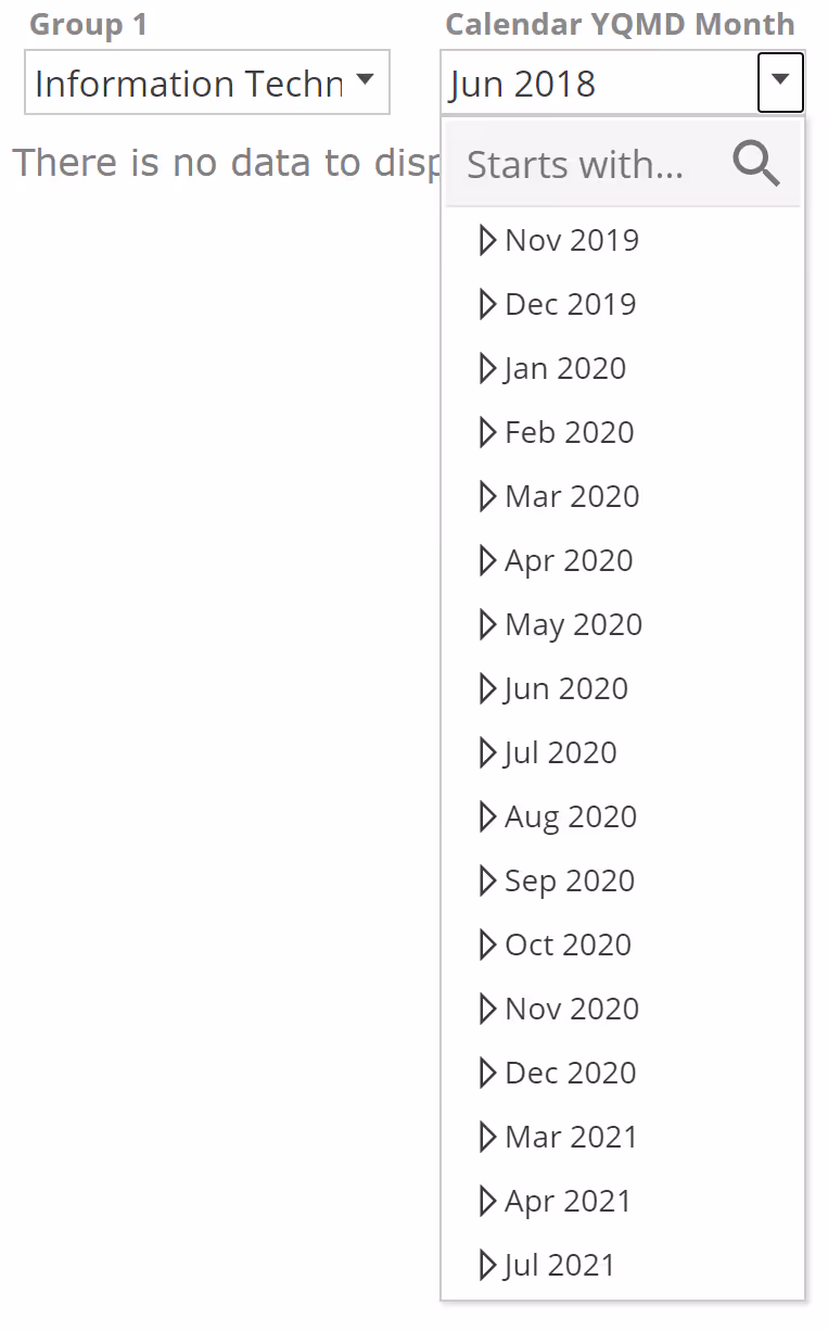 If we now show the Calendar Calendar YQMD Slicer drop-down we see that the Jun 2018 member is not in the list.