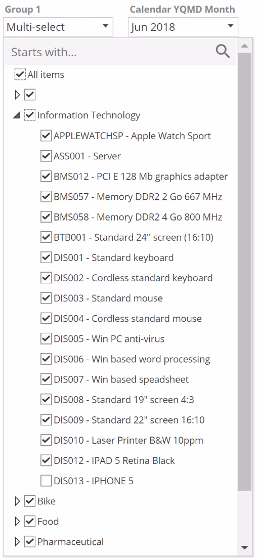 Only ever the selected items – first ensure the All items parent item is unchecked, now check Information Technology, Bike, Food, Pharmaceutical, and Chemical. Observe that the All Items parent's border is now dashed and unchecked.
