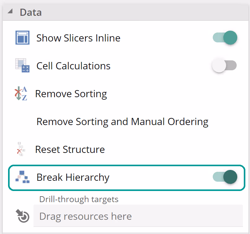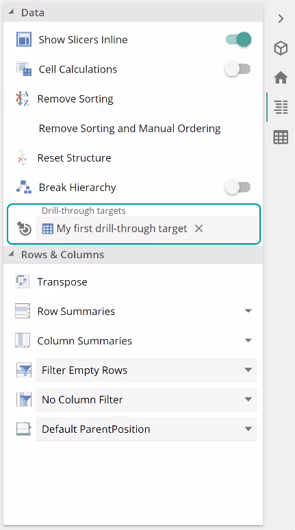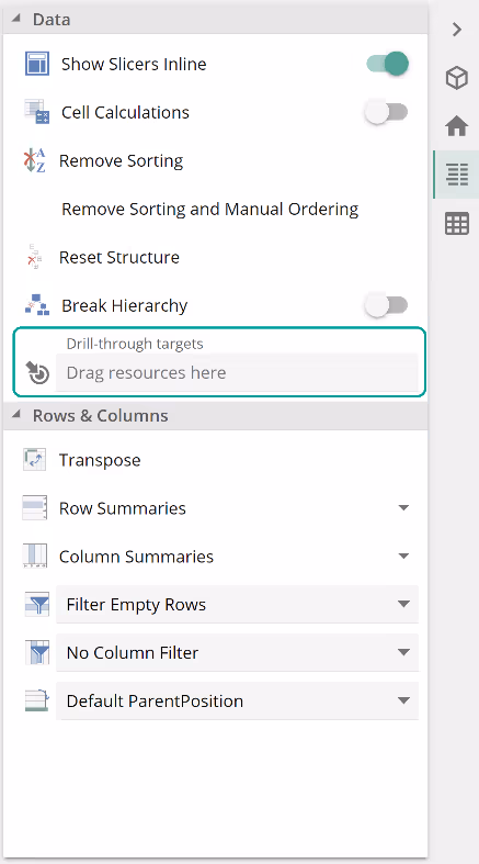 We will introduce additional resource and function-specific slicer functionality in future sections, but for now, let's quickly define a drill-through target for our Analysis Report.