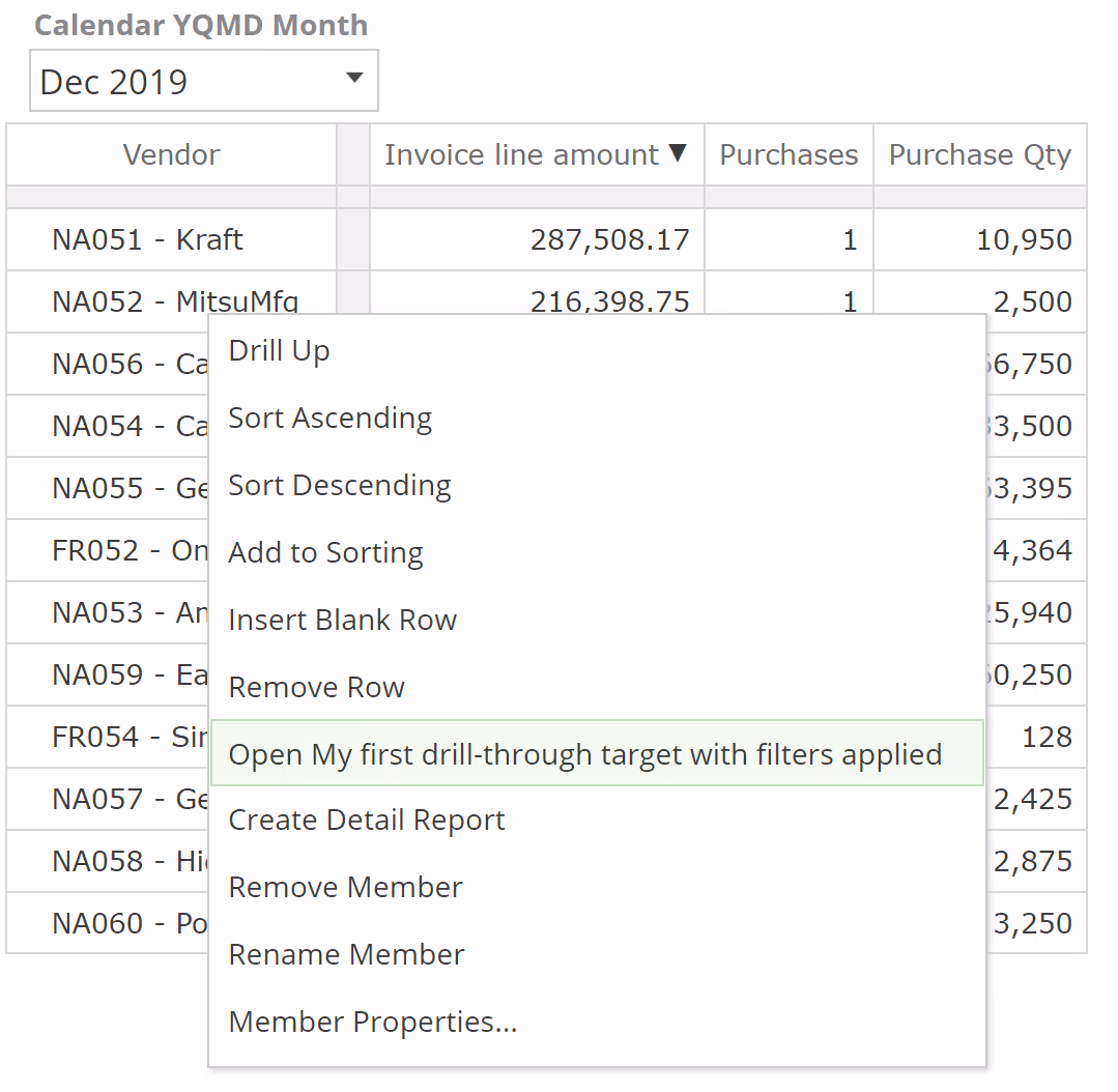 The first thing to note is that conveniently our Calendar YQMD Month slicer selection in My first analytic has transferred corresponding slicers in our target. You will also note that there is a new Vendorslicer, keeping in mind that My first drill-through targetdid not include a Vendor slicer. This is in place because the Rows, Columns placeholders of the starting Analysis Report are all translated into slicers on the drill-through target. Moreover, where possible, the selections themselves are transferred. From My first analytic, we right-clicked on NA052 – MitsuMfg, and you can see that this is now the default selection of the Vendor slicer in our alternate view. Some advanced Analysis Report designs preclude this transfer of selection, but this is beyond the scope of this document.