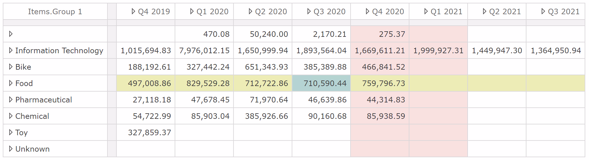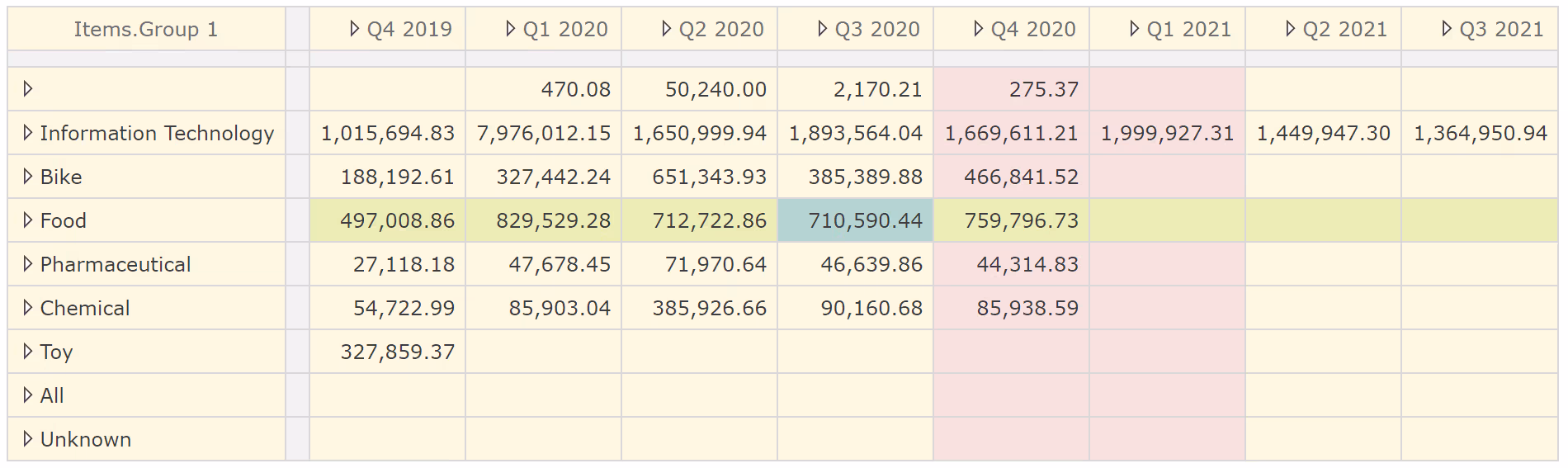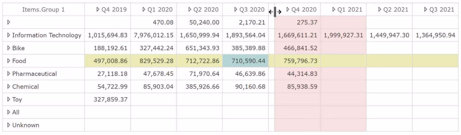 By inserting a blank column after Q3 2020, Q4 2020 is now the sixth column instead of the fifth (excluding the row-headers column). Importantly, this index change did not affect the formatting of Q4 2020 (or any column to the right of it) because, as stated, formatting is against the member or measure. This applies equally if a row/column is defined as a combination of members, as was the case when we combined item groups and vendors on the Rows placeholder.