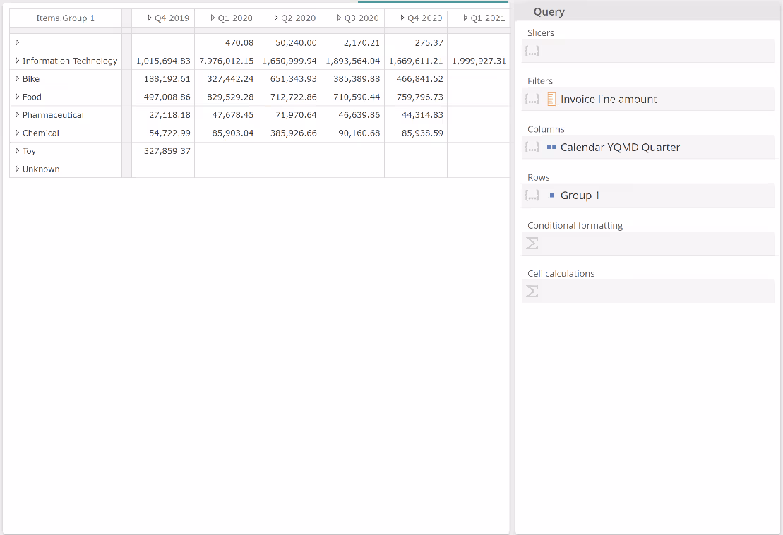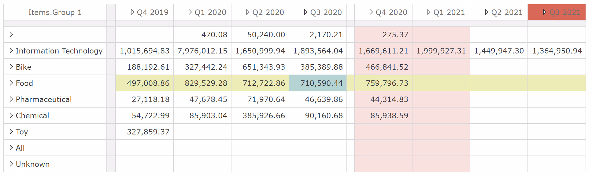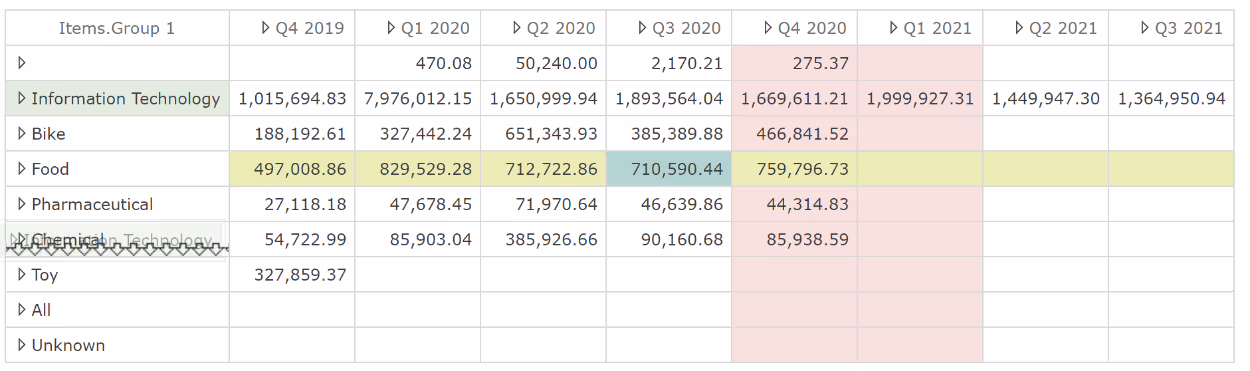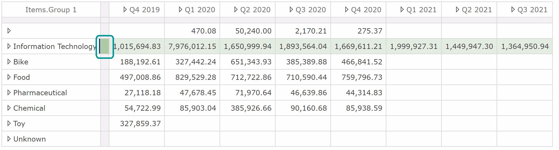 By inserting a blank column after Q3 2020, Q4 2020 is now the sixth column instead of the fifth (excluding the row-headers column). Importantly, this index change did not affect the formatting of Q4 2020 (or any column to the right of it) because, as stated, formatting is against the member or measure. This applies equally if a row/column is defined as a combination of members, as was the case when we combined item groups and vendors on the Rows placeholder.