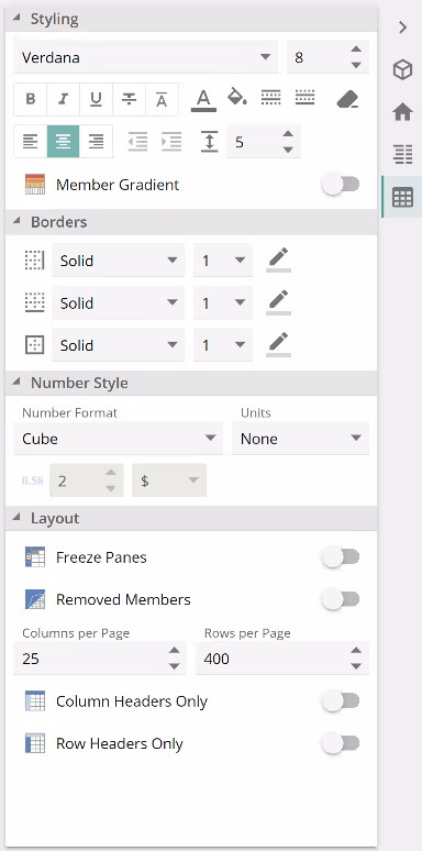 Formatting in Data Hub is a matter of selecting cells and headers, then interacting with the relevant Table panel options. You can format multiple cells and headers at a time with Ctrl-click and Shift-click for cell or header ranges (as in Excel). Take a minute to familiarize yourself with the formatting options within the Table design panel by hovering over each icon.