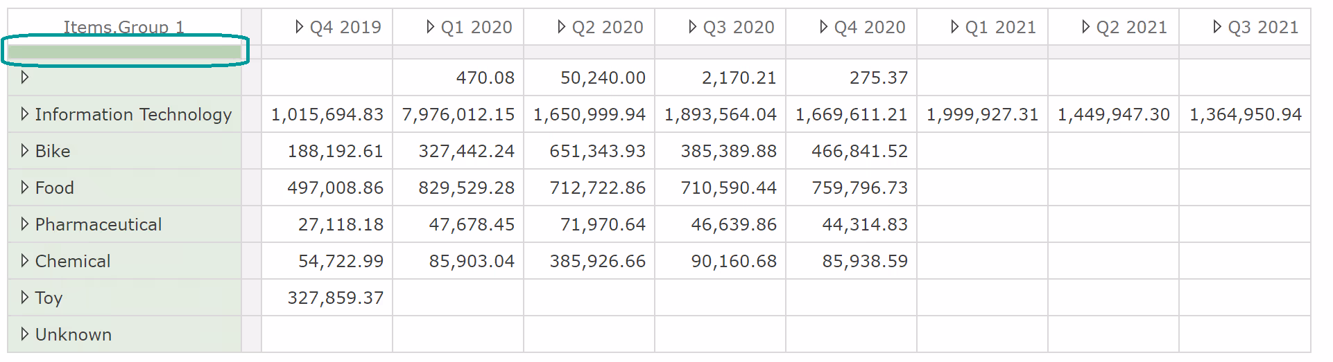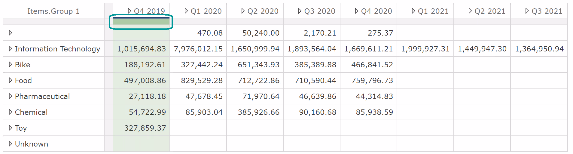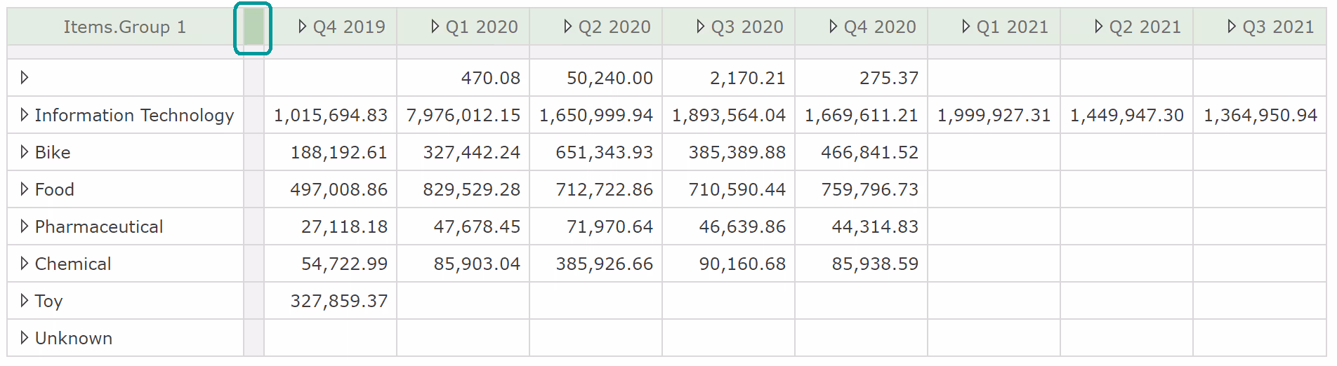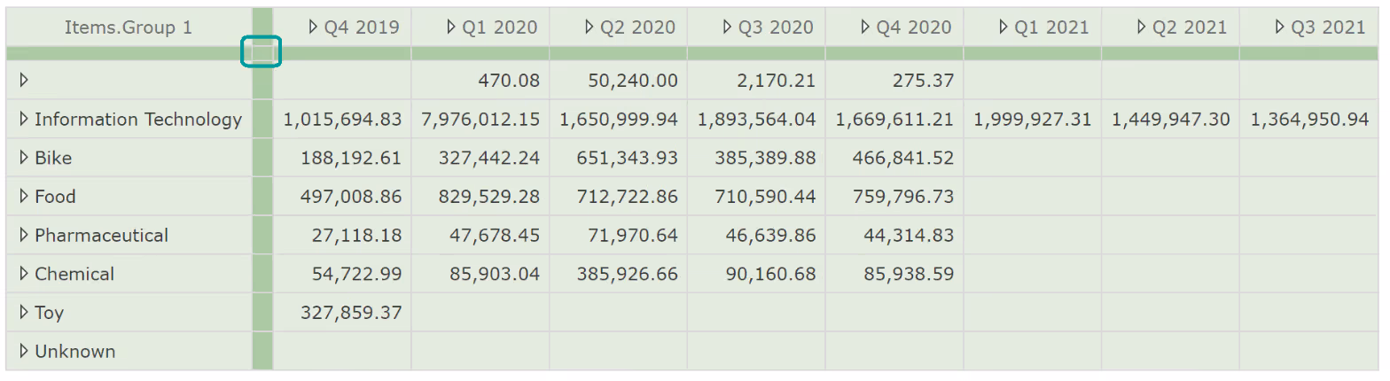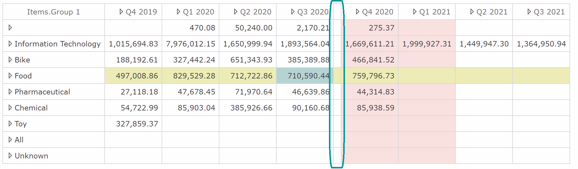 This example provides us an opportunity to introduce an important concept. Formatting is against the member or measure and not the row/column index. We can demonstrate this and another feature simultaneously, specifically blank rows/columns: Right-click Q3 2020 and select Insert Blank Column from the header menu. The result is shown in the following image.