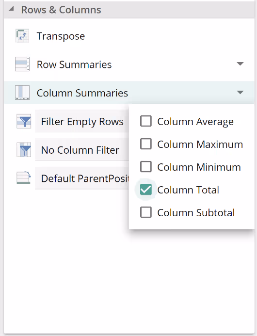 And what makes subtotals interesting is that you have control over which totals are provided. There is now a new option in each hierarchy's column header menu (keep in mind subtotals were applied to columns).