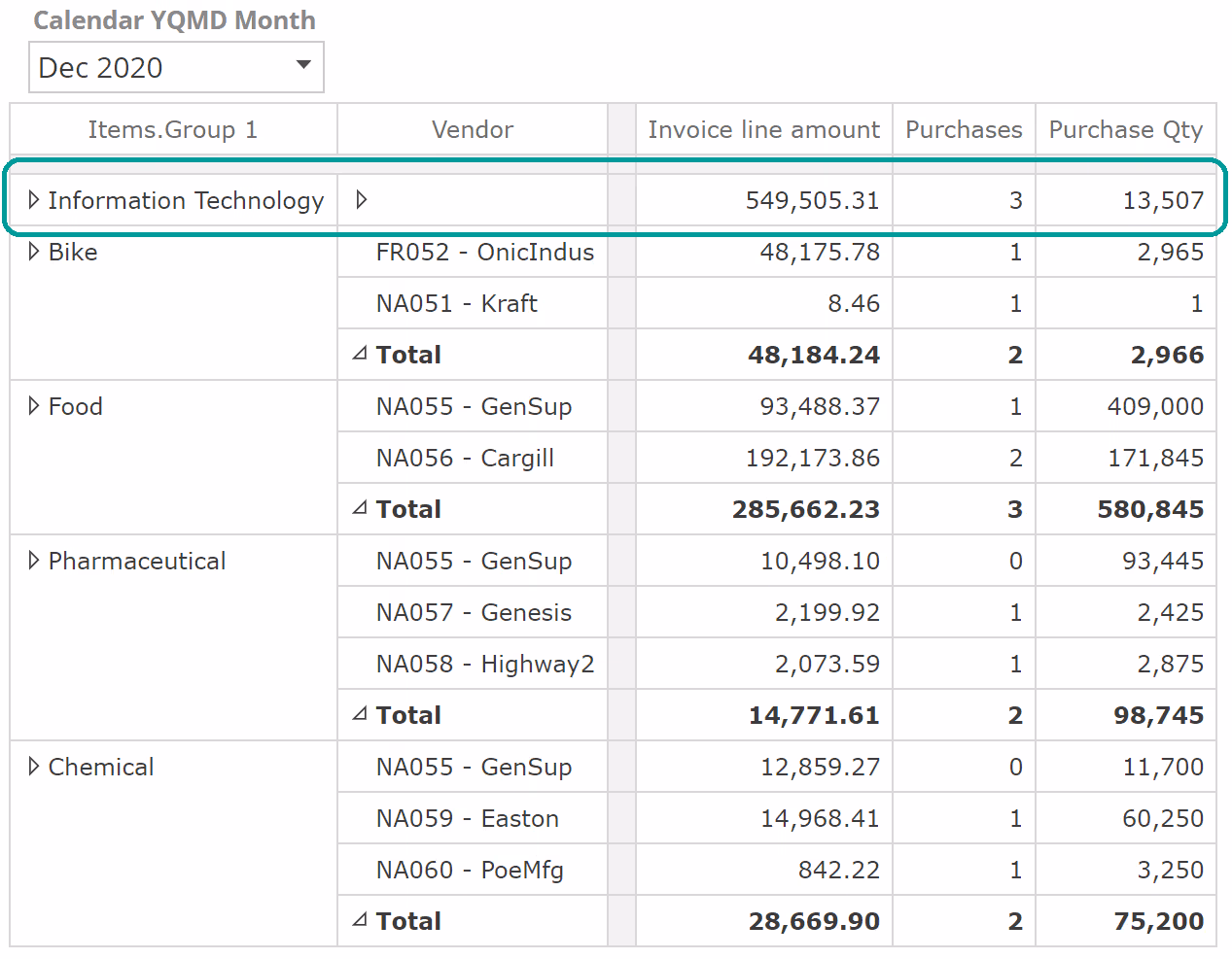 You can also collapse the members for a given subtotal by clicking on the small triangle in the relevant Total cell. In the following, we've collapsed the subtotal for Information Technology.