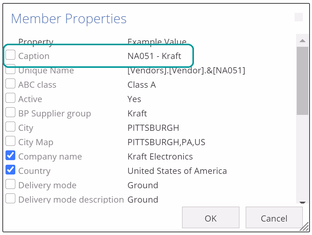 Note that Caption is now unchecked. Rows default to showing the attribute's Caption (NA051 - Kraft), but here we've elected to show the Company name instead (Kraft Electronics). Country is checked. The result of these changes is the row headers for the previous image.