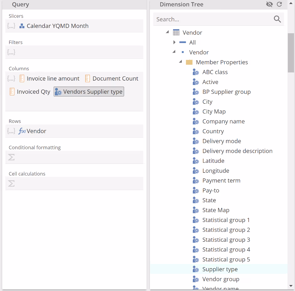 The new Vendors Supplier Type column was configured quite differently. The following Query design panel shows the Supplier type member property on the dimension tree and the Columns placeholder.