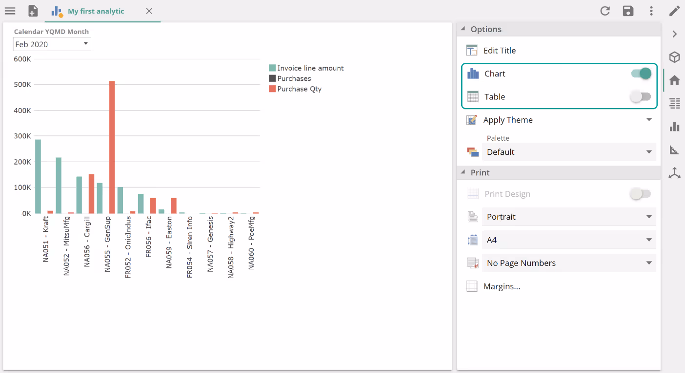 We turn now to charts. Let's take My first analytic, which we saved some time back, and from the Home design panel disable Table, then enable Chart. The result should be as follows.