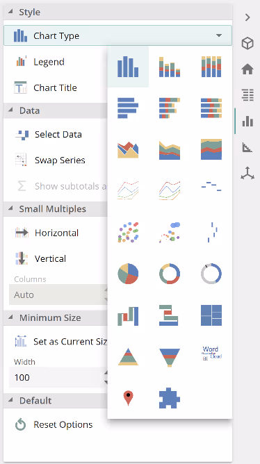 We won't talk to the specifics of configuring Small Multiples, nor will we speak to the specifics of configuring many of the options in the Analysis Charts section. Again, all required information is available in the online documentation. Before moving off the Chart design panel, take a minute to review some of the other options available.