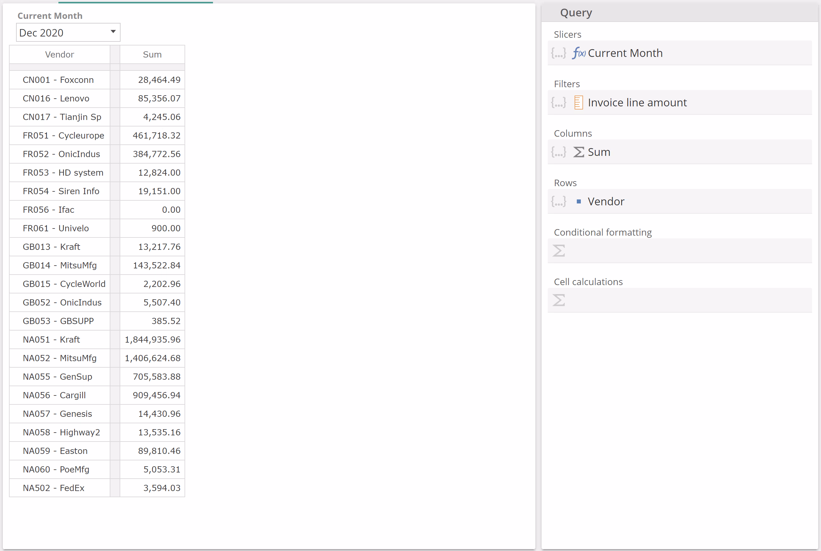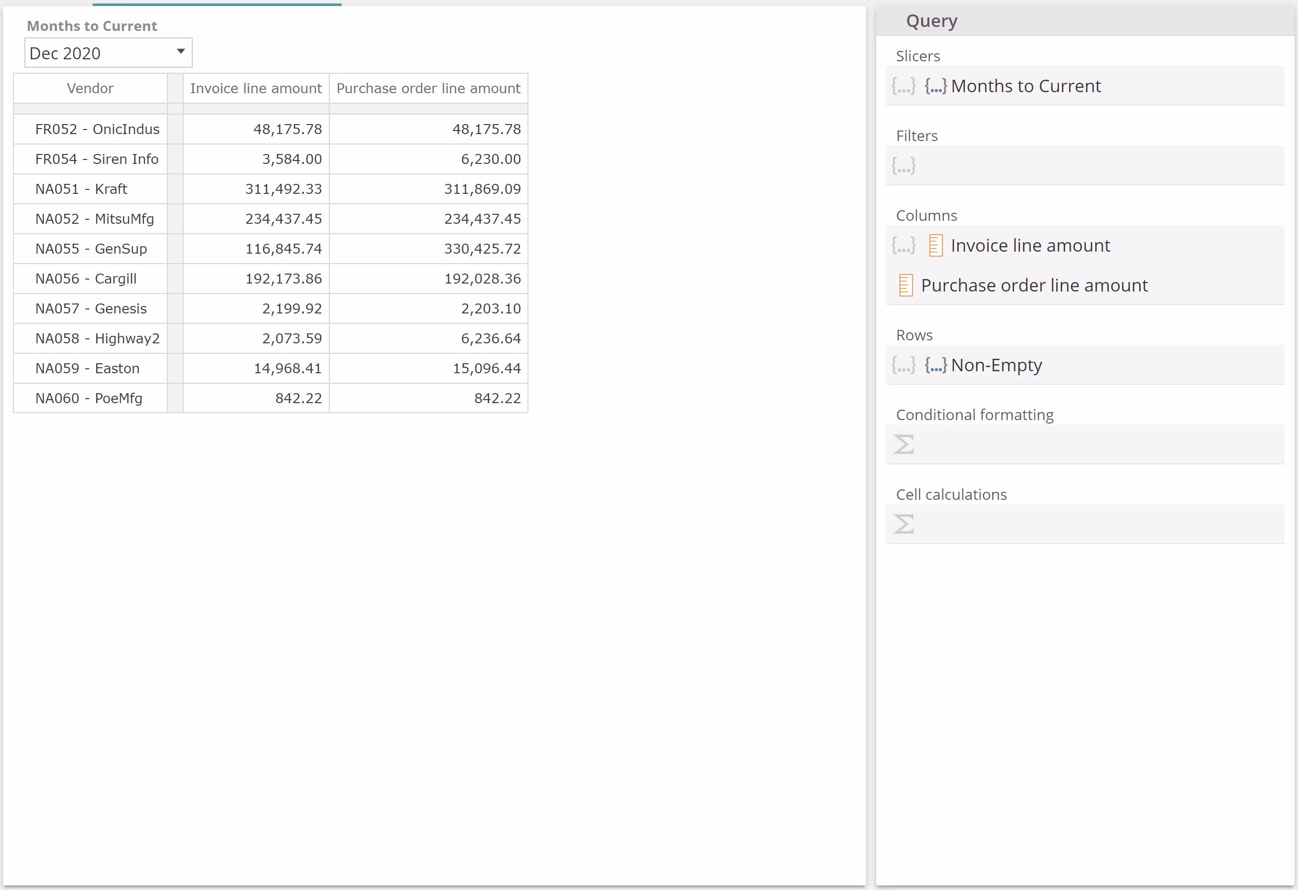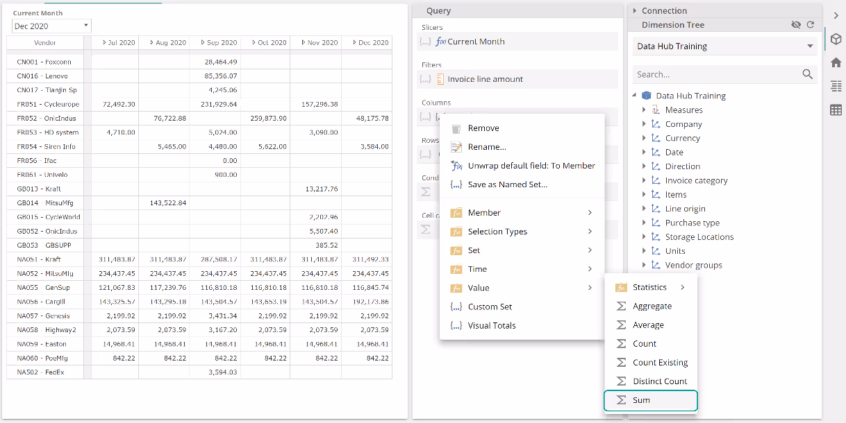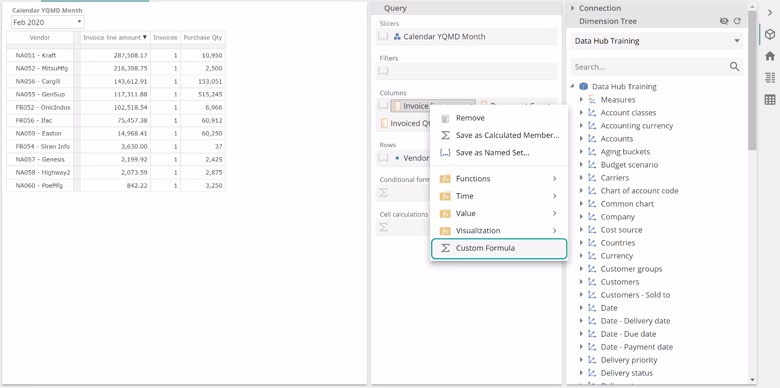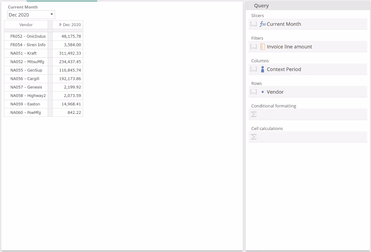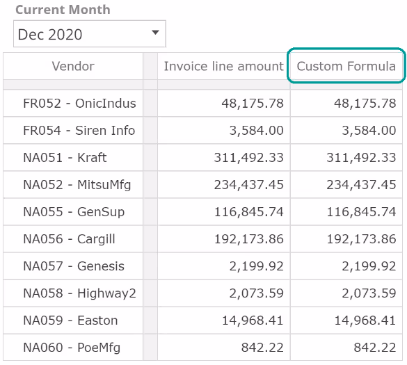 In this example with an empty Formula, each Sum value is simply the sum of the six months to Dec 2020, for the given vendor and for the Invoice line amount measure provided in the Filters placeholder. Let's now populate the Formula placeholder. To simplify this discussion (and in order to leave a topic aside for later), remove the Invoice line amount from the Filtersplaceholder and now populate the Sum Formula placeholder as follows.