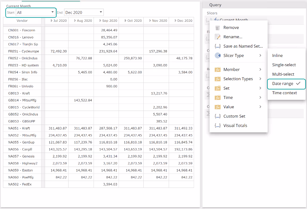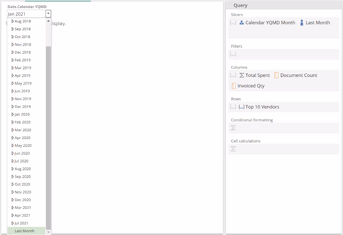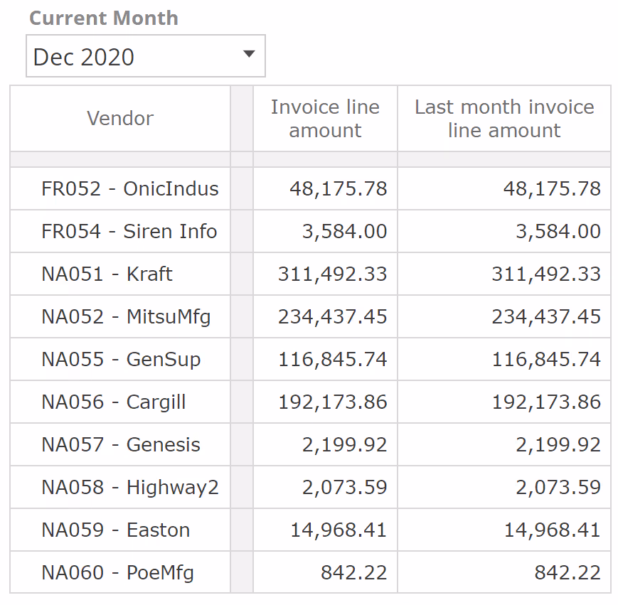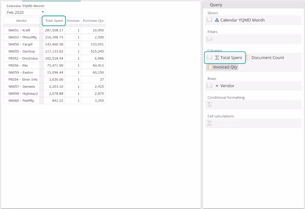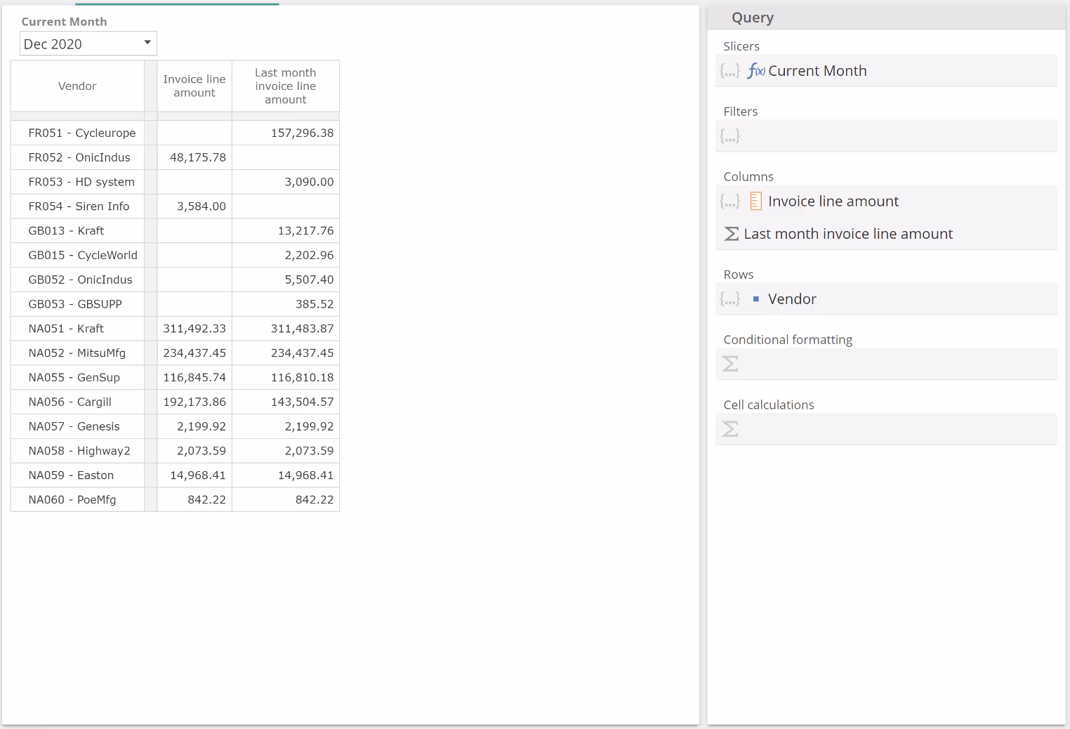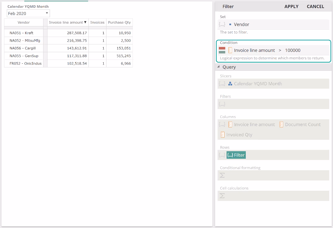In this example with an empty Formula, each Sum value is simply the sum of the six months to Dec 2020, for the given vendor and for the Invoice line amount measure provided in the Filters placeholder. Let's now populate the Formula placeholder. To simplify this discussion (and in order to leave a topic aside for later), remove the Invoice line amount from the Filtersplaceholder and now populate the Sum Formula placeholder as follows.
