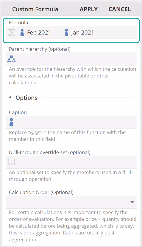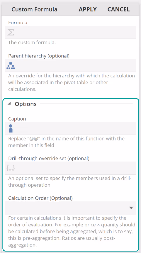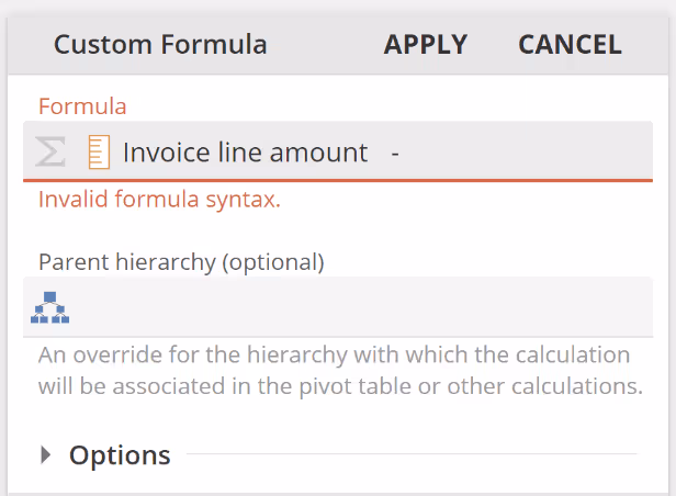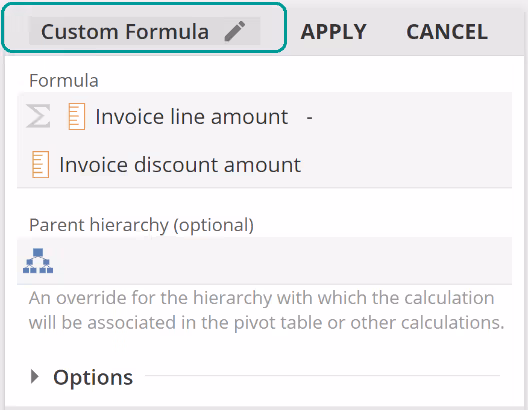 We've already seen Custom Formula as the basic go-to Function for entering formulas. We will talk to the Group-by hierarchy placeholder in the next section. We will also talk to the common Options area later in this article, so for now, let's move on.