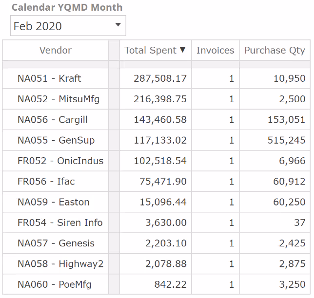 Because there weren't many different vendor sales in the selection month, our Top Count function's effect is a little subtle, but if you look at the table carefully, you will note that there are now exactly ten rows, where previously there were a few more.