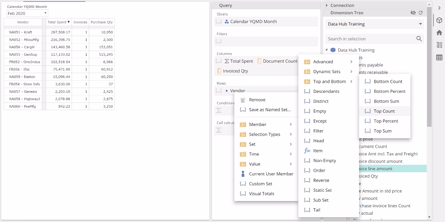 From the Query design panel, right-click on Vendors level from the Rows placeholder and find the Top Count function from the Functions menu (do note its location in the Set folder).