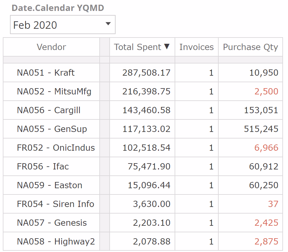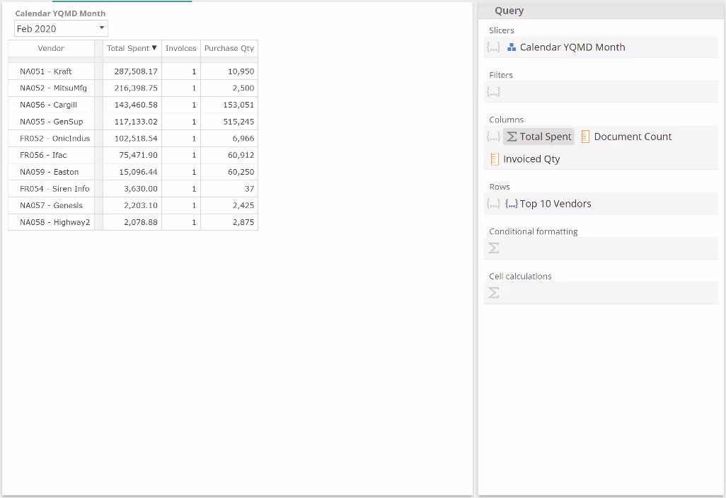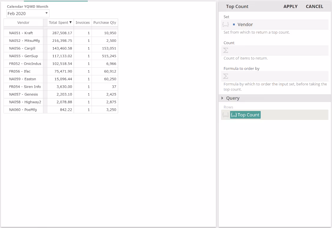 To come closer to reproducing the bottom-left cell from the pre-built Purchase manager dashboard, we now need to change our table's rows only to show the top 10 vendors (for the given Slicer selection). For this, we make use of a Set Function that returns, you guessed it, a set and specifically the set of top 10 members.