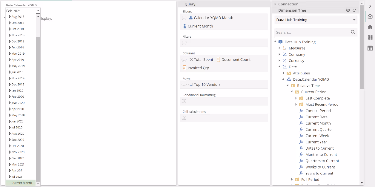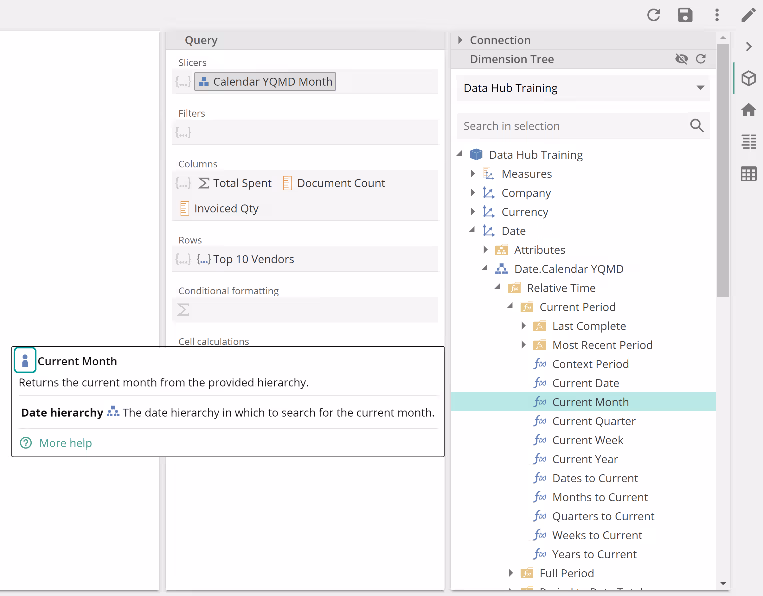 Let's walk through one more Function type example before we discuss theory. This time, we'll configure the Function using a different workflow, specifically dragging the Dimension Tree Function. From the Query design panel, expand the Date dimension, the Date.Calendar YQMD hierarchy, the Relative Time and Current Period folders, and hover over the Current Month Function.