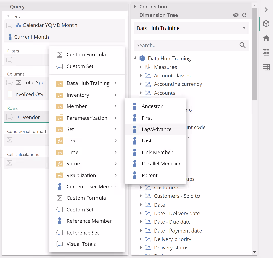 Again, a set is a set of members, so it is perfectly acceptable to show the Lag/Advance Member Function in the Rows placeholder menu. Why didn't we see it when in the Top 10 Vendors placeholder tab menu within the Rows placeholder?