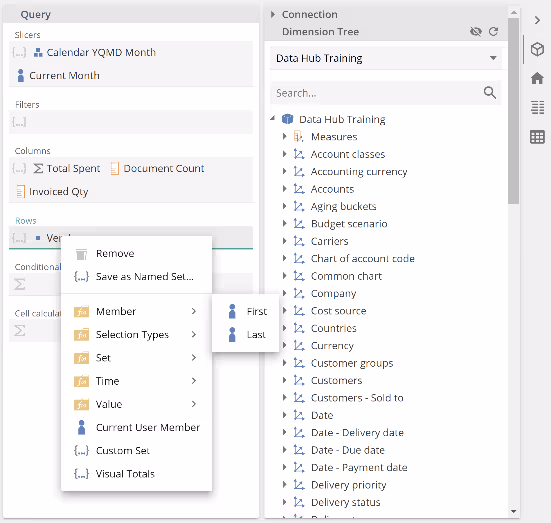 Set placeholders – These accept Set Functions, Member Functions, and Value Functions(in addition to relevant Dimension Tree items). Value Functions are treated as members, as from the previous point. We saw an example of this behavior when Total Spent (a Value Function) was placed in the Columns (Set) placeholder.