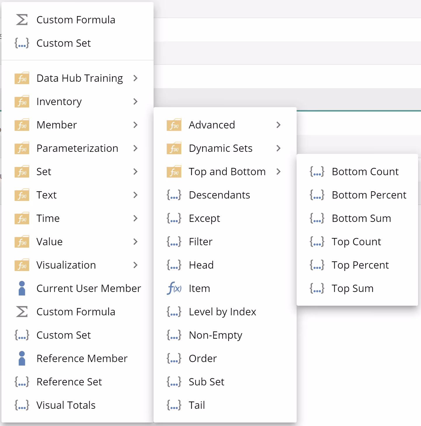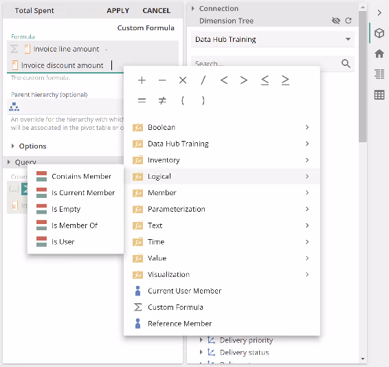 To describe this behavior, let's start with placeholder menu filtering. We saw the placeholder menu twice (and the placeholder tab menu once). We saw it once for the Rows placeholder and then for the Formula placeholder (inside Total Spent). The Formula placeholder menu included the additional Logical folder. Logical functions return true or false values. A set is a set of members and not a set of values. Therefore, the application does not allow you to place a Logical function directly into a set. So we see, the placeholder menu is filtered to only show Functions appropriate for the given placeholder type.
