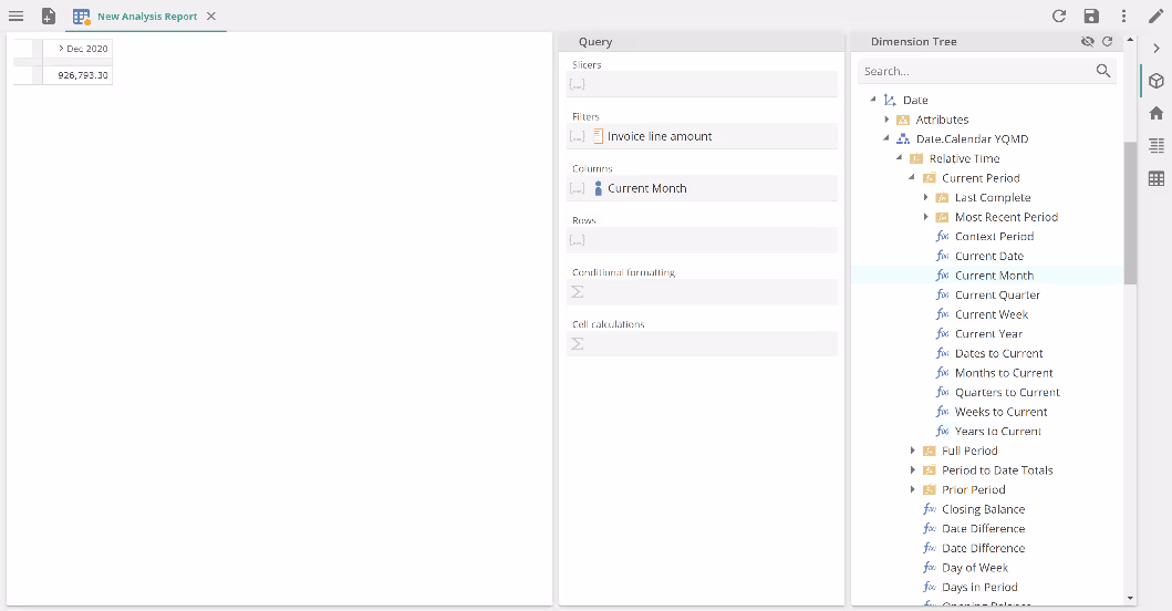 To get started, create a new Analysis Report, place our familiar Invoice line amounts measure in Filters. The drag the Current Month Function from the Date.Calendar YQMD hierarchy's Relative Time folder to the Columns placeholders, as in the following image.