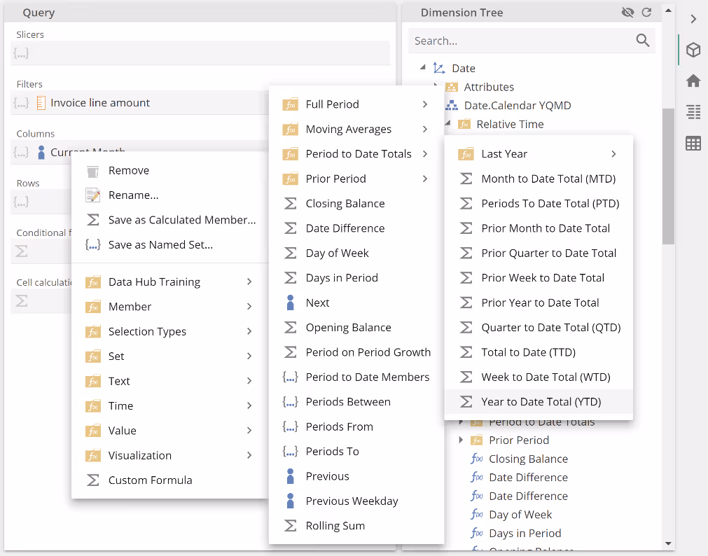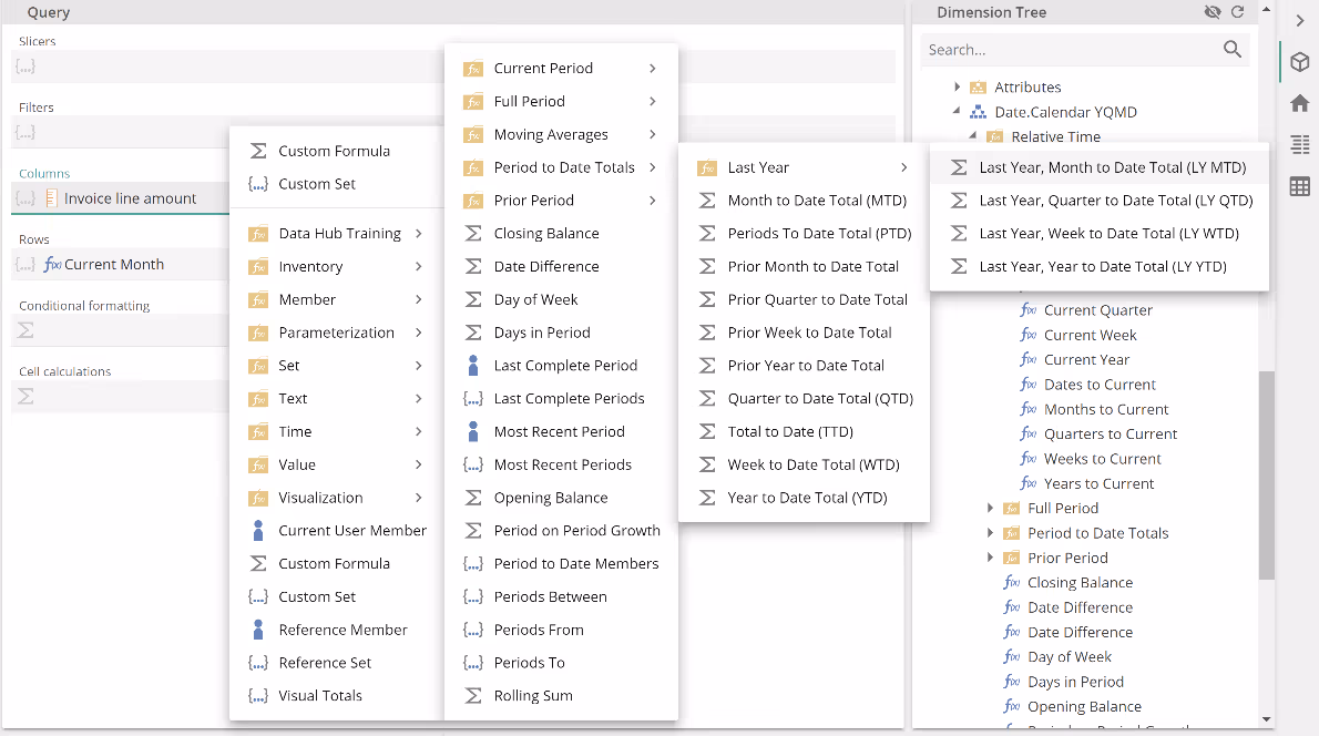 You will also see there are non-Time selection types. However, the Time folder selection types are more commonly used. We will return to discuss this topic a little further in a later section. Back to the design at hand, show the placeholder menu for the Columns placeholder (right-click in the space to the right of the Invoice line amount measure). Expand the menu to locate the Last Year, Month to Date Total (LY MTD) Function, as in the following. We could also have taken this function from the Dimension Tree, but you'll soon see why we've taken this route.