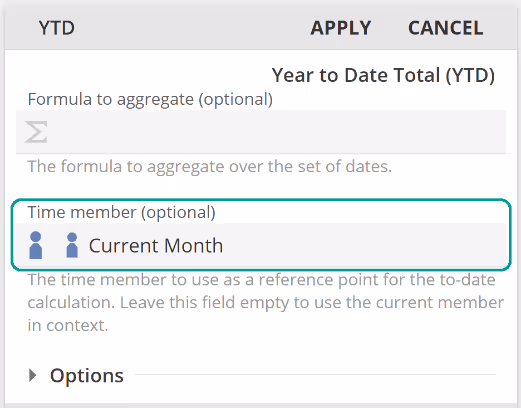 Click on the YTD function in the Columns placeholder. Firstly, you will note the Current Month function in the Time member placeholder. Time member is not the primary placeholder, but if you wrap a Date-hierarchy member in a Time Function, the Time member is treated as if it were the primary field for that single action. Had we, for example, instead wrapped a measure (which is sensibly a non-Time member) in the YTD function, it would have been placed in the primary Formulate to aggregate placeholder.